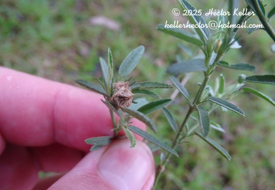 Hierba erecta, 20-30 cm de altura. Toda la planta con pelos estrellados multiradiados, pequeños, amarillentos, no adpresos. Tallos con entrenudos de 10-20 mm de largo, glabrescentes hacia la base. Estípulas lineales, de 2 mm de largo, y hasta 5 mm en las cabezuelas, con pelos estrellados muy pequeños, por lo común sin cilias, salvo algunas pocas en las cabezuelas; pecíolo de 2-5 mm de largo, estrellado tomentoso, cilias a veces presentes en las cabezuelas. Lámina angosto-elíptica, hasta 20 × 3-4 mm, margen liso o apenas dentado en el tercio superior, ápice agudo, ambas caras tomentosas con pelos multirradiados pequeños. Flor solitaria, sésil o con pedúnculo 1-3 mm, asentado en la unión de pecíolo y estípulas. Este conjunto agrupado en cabezuelas terminales paucifloras, a veces también flores axilares solitarias. Cáliz de 5 mm de largo, totalmente cubierto de pelos estrellados, lóbulos con los márgenes y el nervio medio engrosados, cara interna de los lóbulos pilosa. Pétalos 7-8 × 3 mm. Tubo estaminal glabro o con pelos simples. Carpelos 5. Mericarpos de 5 mm de largo, incluida las aristas de 1 mm de largo, dorso reticulado, piloso, pelitos estrellados y pelos glandulares pedicelados, y márgenes con crestas breves con pelo apical retrorso inconspicuo, caras laterales reticuladas. Semilla solitaria, péndula, con pelos diminutos esparcidos.