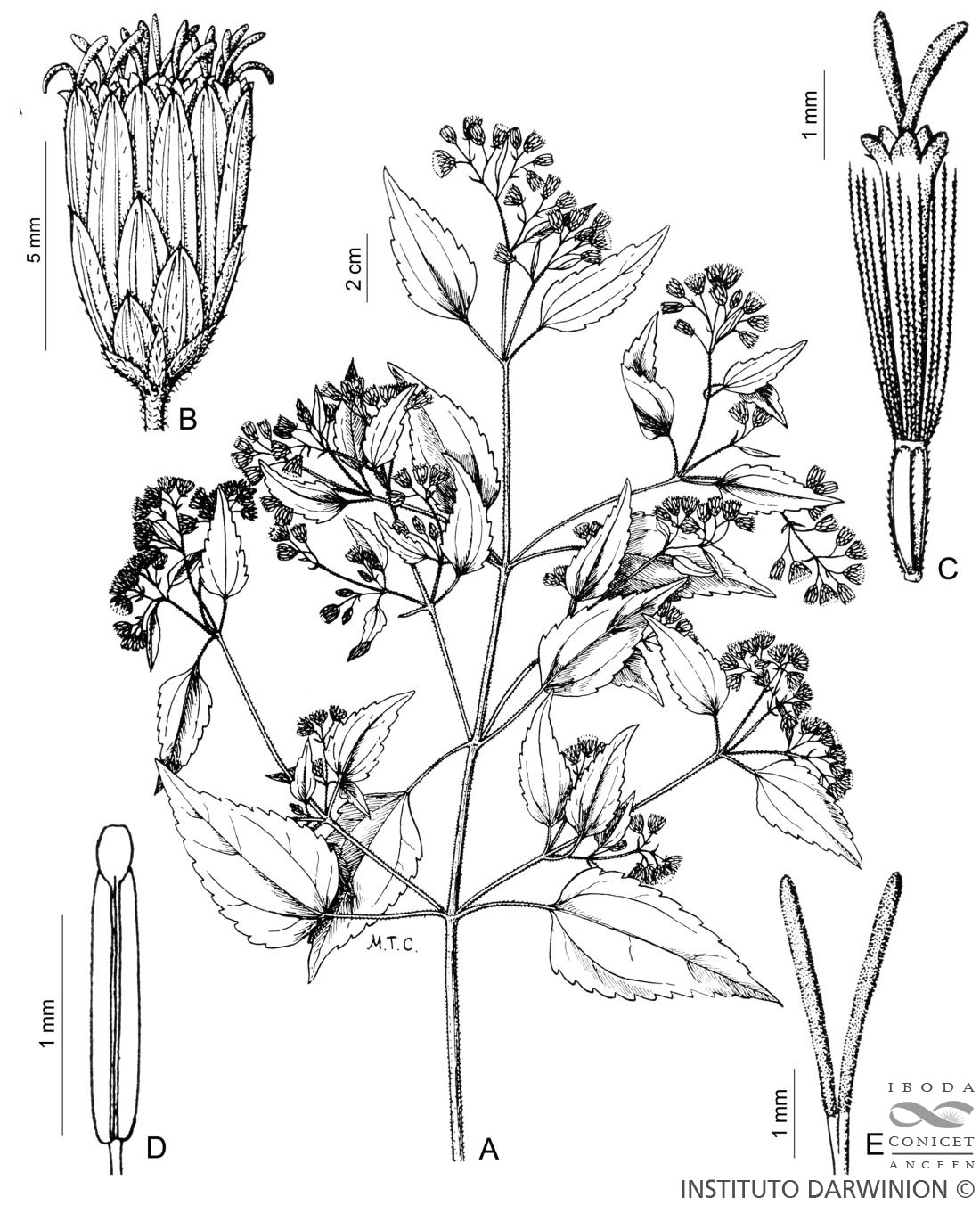 Hierbas perennes ca. 1 m de alto, con tallos delgados, erectos, ramosos, pubescentes, hojosos hasta la inflorescencia. Hojas pecioladas, láminas ovadas u ovado-lanceoladas, de 4-9 × 2-6,5 cm, redondeadas o deltoideas en la base, atenuadas y agudas en el ápice, crenado-aserradas en el margen, con 5-11 dientes a cada lado, 3-nervias, laxamente pubescentes en ambas caras. Capítulos poco a numerosos dispuestos en cimas corimbiformes laxas que nacen en las axilas de las hojas. Involucro acampanado, de 4-5 × 2,5 mm; filarios 20-26, en 5-6 series, pajizos, con 2 surcos en el dorso, los exteriores más cortos, ovado-lanceolados, los intermedios lanceolados, los más internos oblongo-lineares, todos agudos en el ápice y subglabros. Flores 20-25, corolas de color liláceo, ca. 6 mm de largo. Aquenios pubérulos en los ángulos, de 2-2,5 mm de largo. Papus blanco.