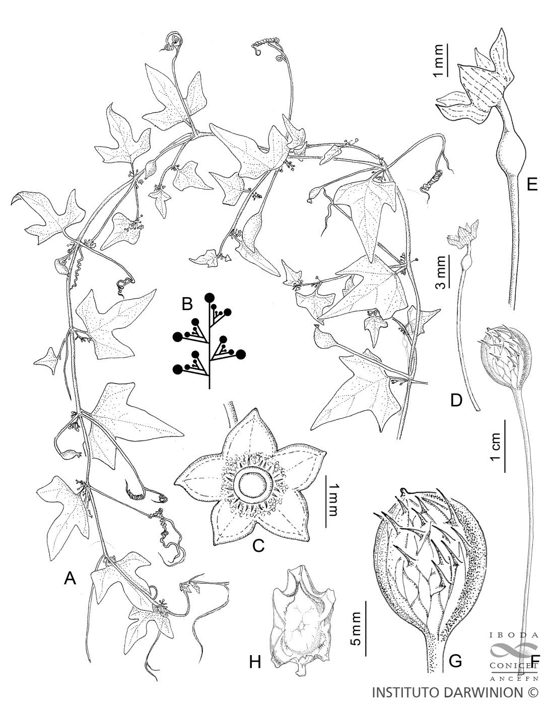 Tallos glabros, estriados, villosos en los nudos. Hojas con pecíolos de 10-13 mm de largo, glabros; láminas ovadas, hasta de 44 × 42 mm, 3-5-lobadas, con lóbulos lanceolado-ovados, membranáceos, papilosos y glabros en ambas caras, pubérulos a villosos sobre las venas en la haz y pubérulos sobre las venas en el envés. Zarcillos simples o asimétricamente 2-fidos, glabros. Tirsos estaminados cortamente pedunculados, de 10-18 mm de largo, sin un eje principal definido (excepcionalmente sí, y en ese caso son más largos), cimas laterales siempre laxas, con eje secundario y pedicelos florales bien desarrollados. Flores estaminadas de 2,5-2,6 mm diámetro; pedicelos delgados, de 2,5-3 mm de largo, glabros; hipanto pateliforme, ca. 1,5 mm de diámetro, con un anillo interno de tricomas nectarígenos entre el androceo y los pétalos; sépalos muy reducidos; pétalos triangulares, ca. 0,75 × 0,75 mm, blanco-verdosos; androceo con una teca horizontal circular rimosa, de 0,75-0,8 mm de diámetro, sobre una columna estaminal muy reducida (prácticamente sésil), con una hilera de tricomas pestañosos sobre la cara inferior. Flores carpeladas solitarias; pedicelos largos, hasta de 40 mm de largo en la antesis, delgados, gráciles, glabros; hipanto ca. 2 mm de diámetro; pétalos de 1,25 × 1,5 mm; ovario ovoideogiboso, acuminado, liso o con 2-3 espinas; óvulos 4; estigma globoso, sésil. Elaterios gibosos, de 17- 19 × 12 mm, lisos o con muy pocas espinas; pedúnculo grácil, de 50-60 mm de largo. Semillas 4 por fruto, de contorno más o menos cuadrangular, comprimidas, de 9-10 × 5-6 × 1 mm.