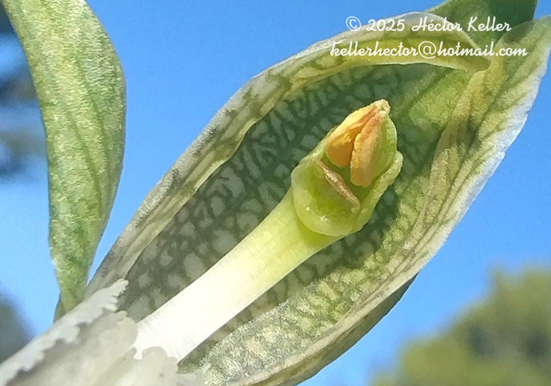 Planta robusta, erguida de 50-100 cm de altura. Hojas basales lanceoladas, agudas, marchitas en el momento de la antesis. Hojas caulinares anchamente envainantes, reticuladas, acuminadas y dispuestas en forma densa. Inflorescencia espiciforme hasta de 40 cm, densa, multiflora, cilíndrica, con flores blancas con retículos y engrosamientos verde oscuro. Sépalos y pétalos con nervadura reticulada, muy dibujada, contrastante con la lámina; sépalo dorsal de 16-20 X 6-10 mm, aquillado, aovado, agudo, retinervado; sépalos laterales de 15-19 X 2,5-3,5 mm, trinervados, más o menos ensiformes, oblicuándose hacia el ápice, éste a veces algo carnoso. Pétalos de 14-17 X 1-15 mm en su parte basal y 2,5-3 mm en su parte apical, asimétricamente espatulados, de ápice agudo. Labelo de 15-18 X 5-9 mm, entero, ascendente, muy carnoso, lingüiforme, a veces estrechado antes de la zona apical, con 3 nervios longitudinales recorridos por laminillas enteras, cortas y carnosas en la mitad basal, la mitad apical densamente verrugosa en ambas caras, ápice redondeado, revoluto; borde cortamente almenado. Columna de 9-13 mm, con ala angosta, recta.