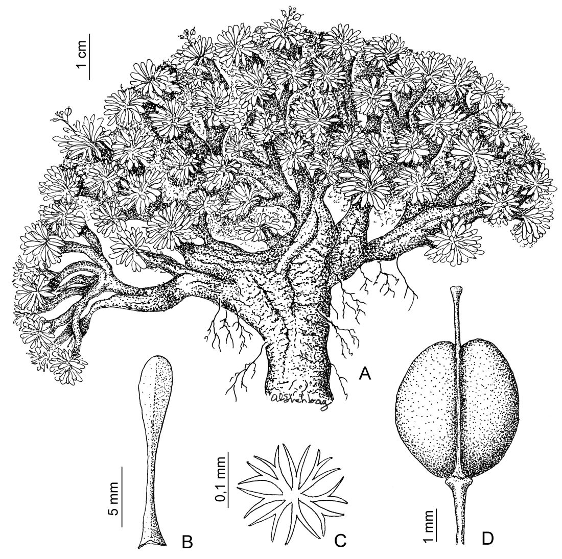 Hierbas perennes, pulviniformes, formando cojines de 10-30 cm de diámetro, densamente pubescentes; tricomas argénteos, sésiles, estrellados, de 0,08-0,13 mm de diámetro, con 16-22 ramas terminales; cáudice grueso, leñoso, con ramas cubiertas con remanentes de hojas de años anteriores. Tallos erectos, simples, de 0,7-1,2 cm de alto. Hojas basales rosuladas; pecíolos de 4-6 mm de largo, expandidos hacia la base, de 1,5-2 mm de ancho; láminas oblanceoladas, de 5-8 × 1,5-2 mm, base atenuada, ápice obtuso, margen entero; hojas caulinares ausentes. Racimos 2- 3-floros, ebracteados, poco alargados durante la fructificación; pedicelos fructíferos delgados, rectos, ascendente-divaricados, de 7-10 mm de largo. Sépalos oblongos, ascendentes, de 4,5-5 × 1-1,2 mm, no sacciformes en la base, con pubescencia argéntea, caducos; pétalos amarillos, espatulados, de 7-8 × 1,5-2 mm; anteras angostamente oblongoides, de 1-1,2 mm de largo; filamentos de 3,5-4 mm de largo; óvulos 10-12. Frutos orbiculares, angustiseptados, de 8-10 × 8-10 mm, moderadamente pubescentes, sésiles, obtusos en la base, ligeramente emarginados en el ápice; replum de 2,5-3 mm de ancho; septo perforado; estilo delgado, de 3,5-4 mm de largo; estigma más ancho que el estilo. Semillas comprimidas, ovoides, no aladas, ca. 2,5 × 1,5 mm; cotiledones acumbentes.