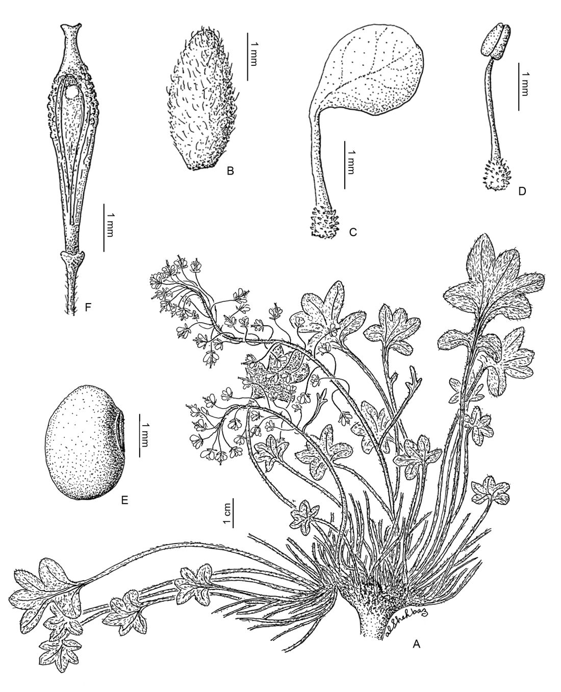 Hierbas perennes, escapíferas, con cáudice compacto y leñoso, ramificado. Tallos aéreos de 6-18 cm, erectos a ascendentes, sólo unos pocos ramificándose desde la base, simples, moderada a densamente pilosos en toda su extensión, con tricomas simples, rectos y extendidos, de 0,1-0,4(-0,6) mm de largo. Hojas sólo basales, largamente pecioladas, pecíolos de 3-12 cm de largo; láminas de contorno suborbicular a reniforme, palmati- o menos frecuentemente pinnati 5-lobadas, en ocasiones con un par adicional de lóbulos menores, de 1-3 × 1-2,5 cm de largo, cordadas a subtruncadas en la base; lóbulos anchamente ovados, enteros, obtusos a subagudos en el ápice; hojas caulinares ausentes o 1, peciolada, mucho menor en longitud que las hojas basales. Racimos terminales, ebracteados, corimbosos, con 30-50 flores, elongados considerablemente en la fructificación, sólo levemente mayores que las hojas, de 7-12 cm de largo; raquis piloso, recto; pedicelos fructíferos divaricados a ascendentes, de 6-12 mm de largo, curvados, delgados, pilosos. Sépalos ovados, de 2-2,5 × 1,4-1,8 mm, pilosos, extendidos, no sacciformes, persistentes después de la fructificación, con márgenes membranáceos; pétalos blancos, obovados, de 3-3,5 × 1-1,8 mm, persistentes, con uña diferenciada, de base dilatada y con papilas; estambres ligeramente tetradínamos, persistentes; filamentos libres, erectos, dilatados y con papilas en la base, de 1,5-2 mm de largo; anteras oblongoides, de 0,5-0,6 mm de largo; glándulas nectaríferas confluentes. Frutos anchamente elípsoides a globosos, glabros; valvas no aladas, de 2,5-3 × 1,5-2 mm; ginóforo de 0,2-0,5 mm de largo; replum expandido apicalmente, con una perforación en el septo; estilo de 0,4-0,6 mm de largo; estigma capitado, levemente 2-lobulado. Semillas oblongoides, ca. 1,5 × 0,8 mm, no aladas, globosas; cotiledones incumbentes.