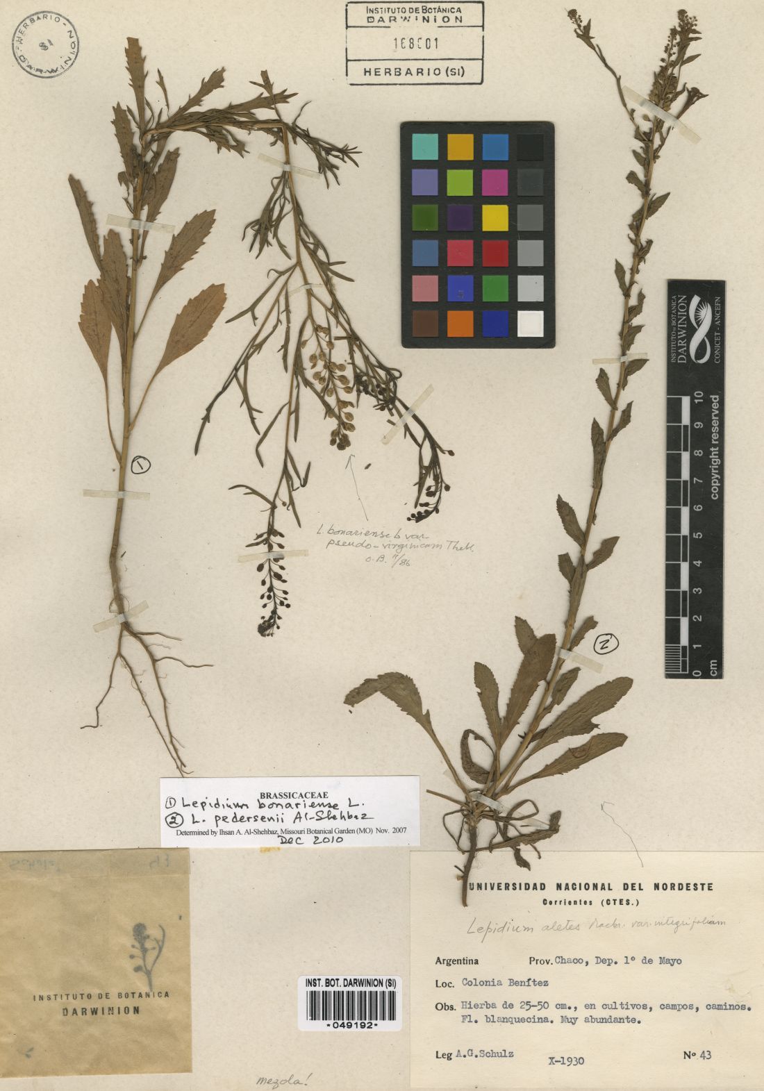 Observaciones: Lepidium pedersenii fue tratada previamente por Thellung (1913) como L. calycinum var. integrifolium y por Boelcke (1986) como L. aletes var. integrifolium. Según el presente tratamiento, Lepidium calycinum y L. aletes son sinónimos de L. auriculatum, especie afín a L. pedersenii por tratarse de hierbas anuales, erectas, con sépalos persistentes y morfología del fruto similar. Sin embargo, ambas especies están aisladas reproductivamente y difieren en importantes caracteres, los cuales están resumidos en Al-Shehbaz (2010: 158) y en la clave incluida en este documento.