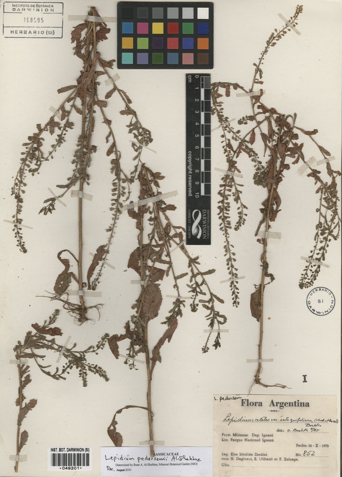 Observaciones: Lepidium pedersenii fue tratada previamente por Thellung (1913) como L. calycinum var. integrifolium y por Boelcke (1986) como L. aletes var. integrifolium. Según el presente tratamiento, Lepidium calycinum y L. aletes son sinónimos de L. auriculatum, especie afín a L. pedersenii por tratarse de hierbas anuales, erectas, con sépalos persistentes y morfología del fruto similar. Sin embargo, ambas especies están aisladas reproductivamente y difieren en importantes caracteres, los cuales están resumidos en Al-Shehbaz (2010: 158) y en la clave incluida en este documento.