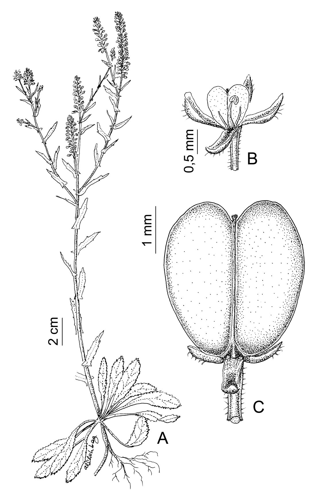 Hierbas anuales, a menudo estrigulosas, con tricomas de 0,2- 0,5 mm de largo. Tallos de 15-45 cm de alto, erectos, por lo general ramificados y divaricados en la porción superior, estrigulosos, con tricomas retrorsos o rara vez extendidos. Hojas basales de 2- 8(-11) × 0,3-1,5(-2,5) cm; pecíolos de 0,5-3,5(-5) cm de largo; láminas oblanceoladas, glabras o pubescentes sólo sobre el nervio central, margen serrado a serrulado, ciliado; hojas caulinares medias de 1-2,5 cm × 2-6 mm, sésiles, auriculadas, el margen subentero a serrado. Racimos densos, estrigulosos, con tricomas retrorsos o más raramente extendidos; pedicelos fructíferos delgados, fuertemente recurvados en su porción media, ascendentes en la base, distalmente divaricados, de 2-3 mm de largo, estrechamente alados, adaxialmente estrigulosos y ciliados en el margen. Sépalos oblongos, de 0,5-0,8 mm de largo, persistentes, puberulentos en la superficie exterior, el ápice blanco; pétalos blancos, de 0,3-0,5 × 0,03-0,05 mm; estambres 2, medianos; filamentos de 0,5-0,9 mm de largo; anteras de 0,1-0,2 mm de largo. Frutos dehiscentes, obovoide-orbiculares, de 2,5-3,5 × 2- 3 mm, apicalmente alados, glabros, ápice ampliamente emarginado, escotadura apical de 0,4-0,5 mm de largo; estilo hasta de 0,05 mm de largo, inserto en la escotadura apical. Semillas castaño-rojizas, ovoide-oblongoides, por lo general estrechamente marginadas o aladas, al menos en la porción distal, de 1,2-1,4 × 0,7-0,8 mm; cotiledones incumbentes.