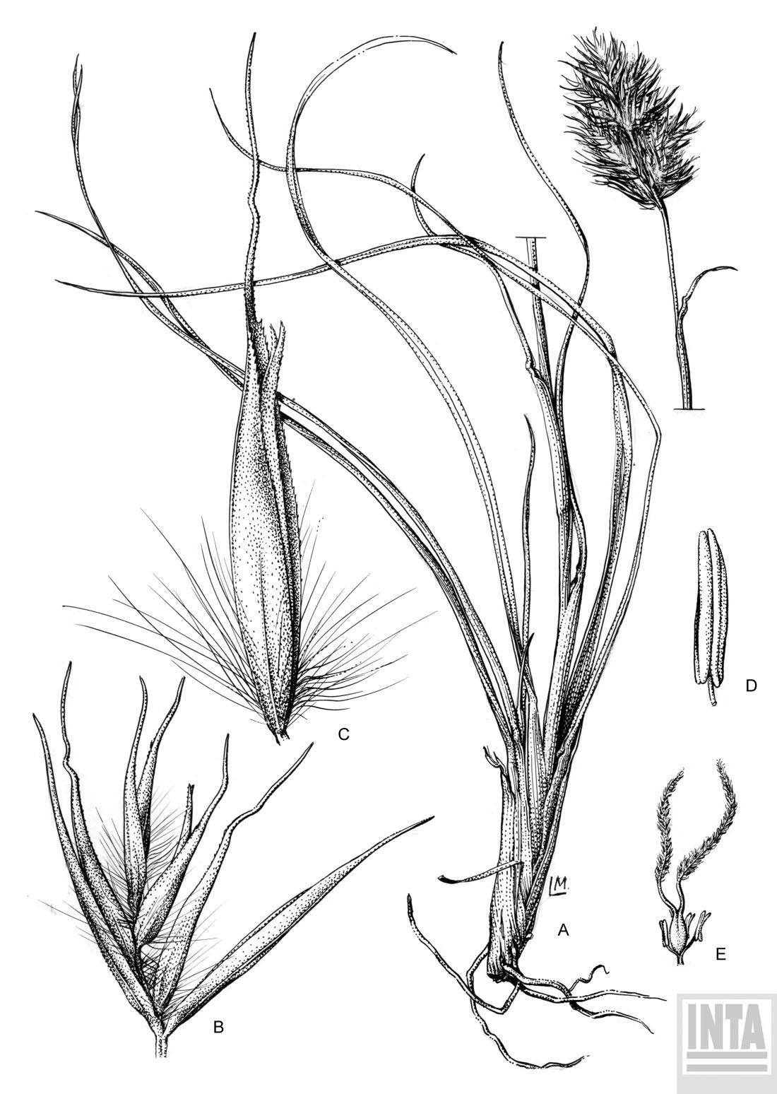 Plantas ginodioicas; tallos glabros o algo estrigosos en los nudos, de 30-60(-80) cm de alto; hojas 9-25(-60) cm de largo; vainas redondeadas, muy cortas, estriadas y violáceas, pilosas o glabras; lígulas pestañosas, pelos blancos de 0,3-2,5 mm de largo; láminas rígidas, plegadas o convolutas, acuminadas, escabrosas en la cara abaxial sobre los nervios, ciliadas en la base. Inflorescencias de (4,5-)6-8(-10) cm de largo, lanceoladas a ovoides, densas, a veces interrumpidas en la base, purpúreas a ocráceas, ramas ascendentes, rígidas, escábridas. Espiguillas 4-6-floras, de 8-12(-16) mm de largo, sobre pedicelos escabrosos de 1-3 mm de largo; raquillas glabras; callos largos y pilosos; glumas subiguales, de (7)-9-13 mm de largo, glabras, violáceas, subuladas, acuminadas, a veces mucronadas o aristuladas; lemma membranácea, pilosa hacia la porción basal, márgenes ciliolados, de (5)-9-13 mm de largo, de los cuales 3-7 mm corresponden a la arista; pálea 2-dentada de 4-5 mm de largo, escabrosa en las quillas; lodículas pilosas hacia el ápice; flor pistilada con estaminodios de 0,1-0,2 mm de largo incluidos o no en las lodículas, estigmas violáceos; flores perfectas con anteras de 2-3,5 mm de largo; cariopsis castaña-clara, de 2-2,5 mm de largo, hilo oval alargado.