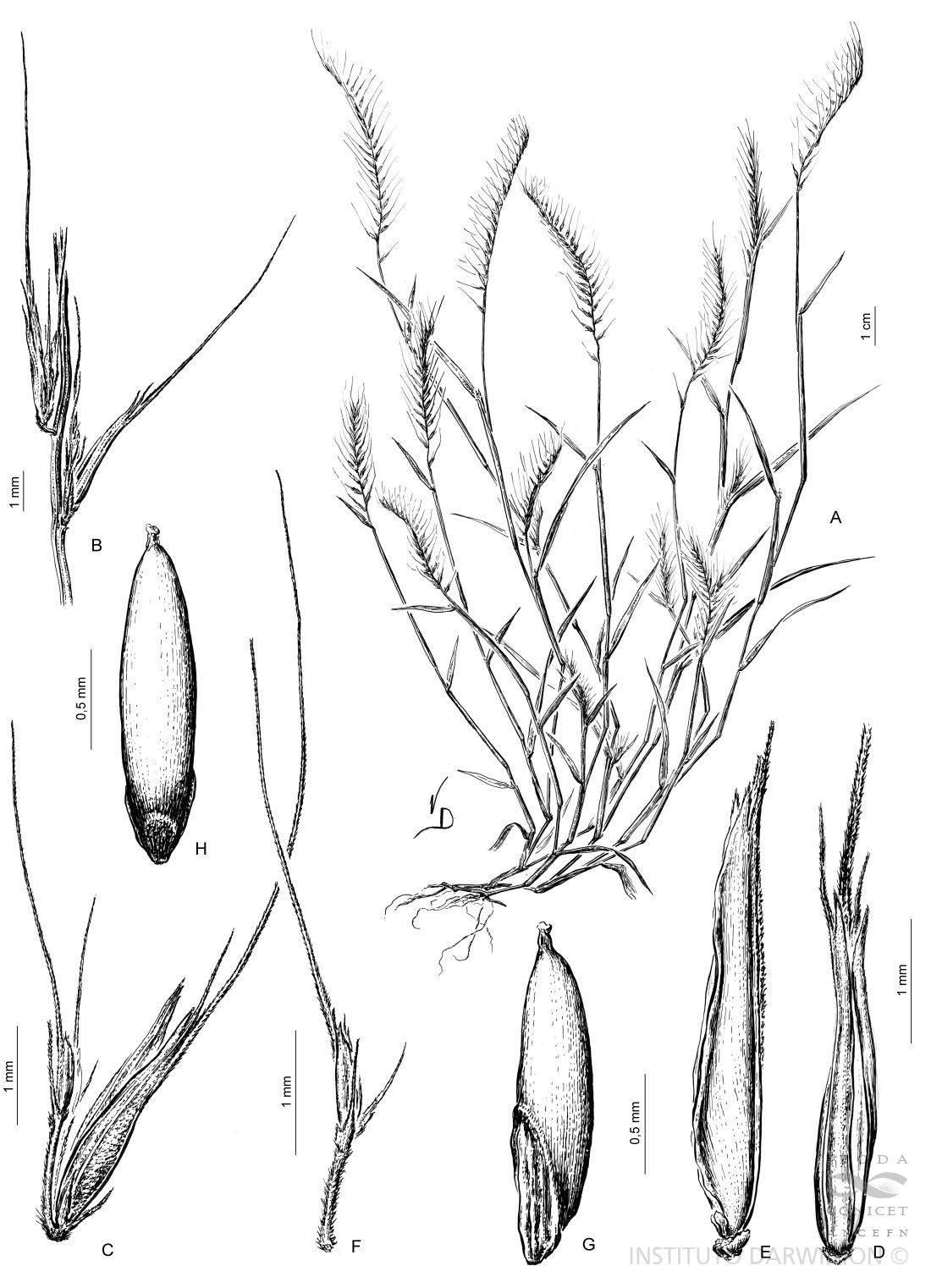 Plantas anuales, cespitosas, delicadas, a menudo densas; cañas de (4-)6-30 cm de alto, glabras debajo de los nudos; entrenudos de 0,6-6 cm de largo, glabros a pilosos; hojas principalmente basales; vainas de 0,5-4,8 cm de largo, más cortas que los entrenudos, glabras a escasamente pilosas; lígulas de 0,6-1,5 mm de largo, ápice truncado y lacerado; láminas planas, de 1,5-6 cm x 0,5-1,5(-1,7) mm; pubescentes y escabriúsculas adaxialmente, mayormente lisas abaxialmente. Inflorescencia una panoja abierta, de 2-6 x 0,5-1,2 cm, con ramificaciones unilaterales de tríadas de espiguillas, cada tríada patente, tempranamente caduca como un grupo, escasamente floríferas, ramas de las ramificaciones primarias de 0,2-0,6 mm de largo, excluidas las aristas, una por nudo. Espiguillas en grupos de 2 ó 3 por rama, grisáceas a purpúreas, los grupos con una espiguilla perfecta de 2,4-3 mm de largo, cortamente pedicelada, los pedicelos de 0,2-0,5 mm de largo, las otras dos espiguillas estériles o estaminadas, largamente pediceladas, los pedicelos de 0,7-1 mm de largo; glumas de 1-1,3 mm de largo, estrechamente acuminadas, ápice prolongado y aristado; lemma de 2,4-3 mm de largo, 3-aristadas, la arista central (3-)5-8(-12) mm de largo, las laterales de 0,8-1,4 mm de largo; pálea de 2,2-2,8 mm de largo, puberulentas, ápice aristado, las aristas de 1-1,2 mm de largo; anteras de 0,5-0,7 mm de largo, amarillentas; cariopsis de 1-1,5 mm de largo, obovoidea, de color crema.