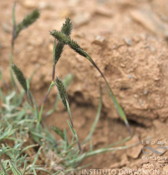 Plantas perennes, cespitosas con bases intrincadas; cañas erectas, más o menos decumbentes, con numerosas, densas y cortas ramas jóvenes, de 3-10 cm de alto, con láminas foliares cortas de 5-12 mm de largo, cañas floríferas hasta de 27 cm de alto, delicadas, finamente híspidas en los nudos, a menudo se origina de cada nudo una rama florífera en las porciones superiores; vainas más cortas que los entrenudos, de márgenes membranáceos; lígulas membranáceas, de 0,5-1 mm de largo, irregularmente erosas; láminas de 12-23 cm x 1-1,2 mm, planas o dobladas, finamente híspidas en la cara adaxial, naviculares a agudas. Inflorescencia una panoja espiciforma densa, de (2-)4-10 cm x 4-8 mm, terminal o axilar, raquis cilíndrico, finamente híspido, con alas angostas, con espiguillas de a pares, a veces solitarias o raramente en tríadas, desigualmente pediceladas, raramente ambas sésiles, las espiguillas se desarticulan en pares o individualmente cuando ambas son fértiles, con los pedicelos adheridos o también tardíamente por encima de las glumas; espiguilla superior generalmente perfecta, a veces estaminada o raramente estéril; espiguilla inferior perfecta, estaminada o estéril. Espiguillas con un antecio, sin extensión de la raquilla, tenuiformes, comprimidas lateralmente, cortamente aristadas, de 3-4 mm de largo (excluidas las aristas), todas las partes estramíneas, algunas veces con toques purpúreos y manchas oscuras; glumas subiguales, más cortas que el antecio, lanceoladas, de 1-1,5 mm de largo; gluma inferior asimétricamente 2-nervia, con dos aristas apicales, una de 2-3 mm de largo, la otra de 1-1,5 mm de largo; gluma superior 1-nervia, con una arista apical de 2 mm de largo; lemma lanceolada, de 3-4 mm de largo, 3-nervia, irregularmente hirsuta entre las márgenes, con una arista apical de 2-3 mm de largo; pálea ca. 2,5 mm de largo, 2-nervia, algunas veces cortamente aristada, hirsuta en su cara abaxial; anteras de 1,5-2 mm de largo; cariopsis de 1,8-2 mm de largo, ca. 0,5 mm de ancho; embrión ½ del largo de la la cariopsis.