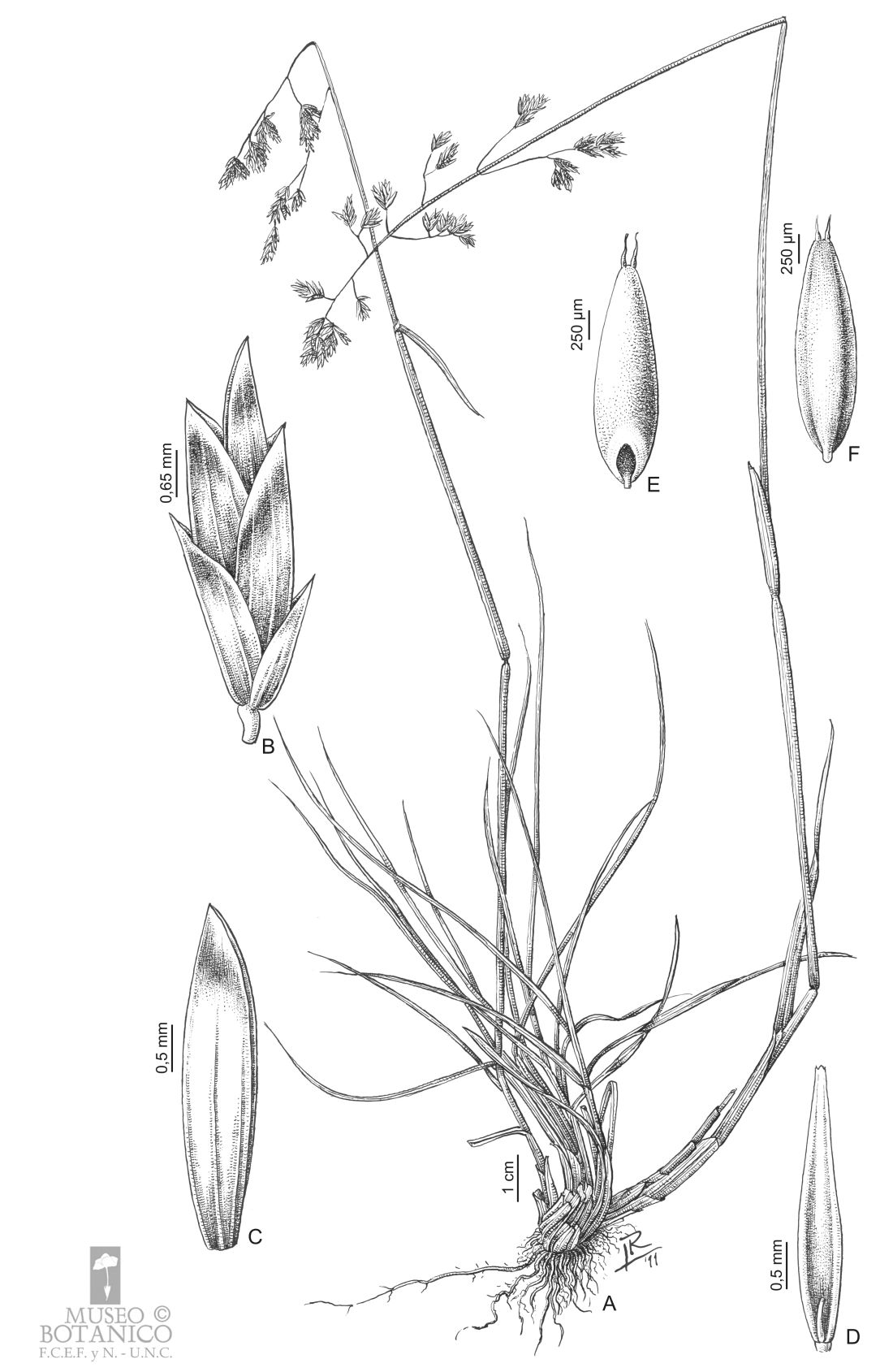 Plantas ginomonoicas, perennes, rizomatosas, ligeramente azulado-verdosas, formando pequeñas matas esparcidas, sueltas, con innovaciones intra y extravaginal; cañas de 10-30 cm de alto, erectas a extendidas, levemente arqueadas o sinuosas, a veces decumbentes o geniculadas en la base; nudos incluidos en el follaje, hojas mayormente basales; vainas con los margenes fusionados hasta en ? de su longitud, cilíndricas, delgadas, lisas, glabras, cuellos lisos, glabros; lígulas truncadas de 1-1,5(-3) mm de largo, decurrentes, lisas o escasa a moderadamente escabrosas, bordes irregulares, algunas veces algo lacerados, lisos; láminas de (2-)4-9 cm x 1-2(-2,5) mm, planas, aquilladas, con margenes involutos, delgadas, lisas en ambas superficies, margenes lisos o con algunos aguijones esparcidos, ápices levemente naviculares a agudos, la lámina más distal algo reducida. Inflorescencias de 2-5(-10) cm de largo, laxas, abiertas, erectas a caedizas, esparcidas, con 1 rama por nudo, 2-3 en las basales, las ramas más largas de 0,5-1,5(-2) cm, con pocas espiguillas por ramas, ramas proximales con 2-4 espiguillas agrupadas cerca de la punta; pedicelos ca. 1 mm de largo, lisos o algo escabrosos. Espiguillas de 5-6(-7) mm de largo, lanceoladas, verdes y doradas en la zona apical, (2-)3(-4)-floras, flores proximales perfectas, las distales pistiladas, entrenudos de la raquilla de 1 mm de largo, lisos, glabros; glumas desiguales, lanceoladas; gluma inferior de (2-)3-3,8 mm de largo, 1-nervia, aguda; gluma superior de 3,3-5 mm de largo, 3-nervia, obtusa y redondeada; callo de los antecios glabro; lemma de (3,3-)4-5 mm de largo, 5-nervia, ampliamente lanceolada, lisa, glabra, nervios laterales diferenciados, margenes lisos, ápice obtuso a agudo, redondeado; pálea con quillas lisas o con pequeños aguijones, superficie lisa entre las quillas; lodículas de 0,8 mm de largo, oblanceoladas con un lóbulo lateral poco profundo; anteras de las flores perfectas 3, de 2,5-3 mm de largo, flores pistiladas con estaminodios de 0,2 mm de largo; estilos ligeramente separados de la base, ligeramente divergentes, estigmas densamente plumosos, blancos, con ramificación secundaria; cariopsis fusiforme, de 1,5-2 mm de largo, con sulco poco profundo, castaño claro, no adherida a la pálea; hilo de 0,2 mm de largo, elíptico.