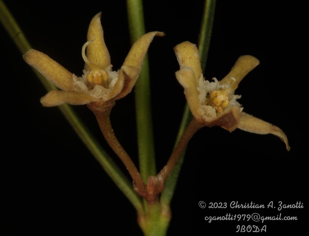 Hierba sufruticosa hasta de 50 cm de alto. Hojas lineales, de 3-5 cm × 1-2,5 mm, glabras. Inflorescencias seudoaxilares cortamente pedunculadas, generalmente 2-floras, los pedicelos ca. 1 cm, glabros. Flores con cáliz con lóbulos triangular-ovados, de 1-1,5 mm de largo, agudos, glabros; corola con tubo breve y lóbulos oblongos, de 3-4 × 1-1,5 mm, enangostados y emarginados en el ápice, glabros o levemente pubescentes en la fauce; corona cortamente tubulosa, crenada, con 5 lóbulos anchamente redondeados, que alternan con otros 5 más angostos; ginostegio subsésil ca. 2 mm con la cabeza estilar prolongada en un apéndice angosto de 3-6 mm de largo, cortamente 2-fido en el ápice; retináculo ca. 0,15 mm de largo, caudículas horizontales; polinios ovoides, ca. 0,2 mm de largo. Folículos fusiformes, de 5-6 cm × ca. 7 mm de diámetro, lisos, glabros. Semillas 6-8, ovadas, de 12-13 × 5-6 mm, diminutamente foveoladas, con penacho de pelos de 1,5 cm de largo.