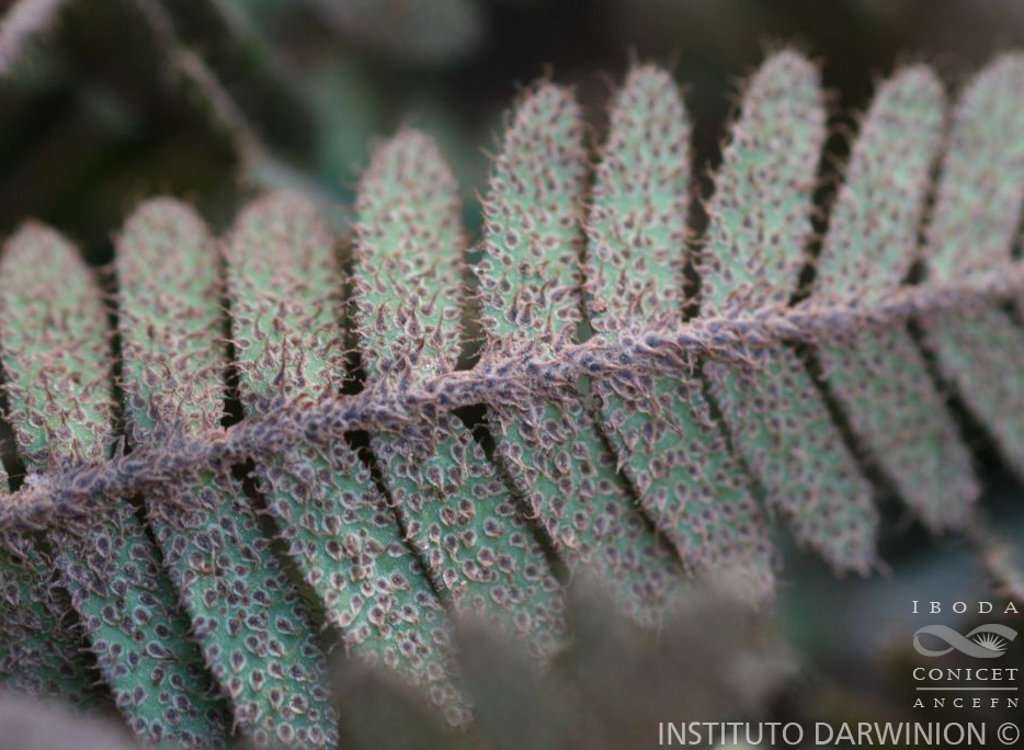 Plantas epífitas o saxícolas. Rizomas largamente rastreros, de 1-2 mm de diámetro, con escamas peltadas, ovado-acuminadas, de 2-7 mm de largo, imbricadas, usualmente castañas, más oscuras en el punto de fijación y más pálidas hacia la periferia, los márgenes denticulados. Frondes menores de 12 cm de largo; pecíolos de 2-6 cm de largo, con escamas semejantes a las rizomáticas; láminas elípticas a elíptico-lineares, pinnadas, de 6-10 cm de largo; pinnas 10-35 pares, generalmente opuestas, contiguas a distanciadas, linear-elípticas, las bases adnatas, los ápices romos, de 10-12 × 3-4 mm, de textura gruesa; cara adaxial glabra, cara abaxial densamente cubierta por escamas ovadas, largamente acuminadas, de márgenes subenteros, pálidas, capiliformes y cubriendo totalmente la superficie foliar; venación poco visible, con venillas laterales libres, furcadas a anastomosadas, determinando una hilera de aréolas a ambos lados de la costa, con una venilla inclusa. Soros circulares, impresos, en una fila entre la costa y el margen con pelos y escamas mezclados con los esporangios. Esporas verrugosas, de 50-52 µm de diámetro ecuatorial.