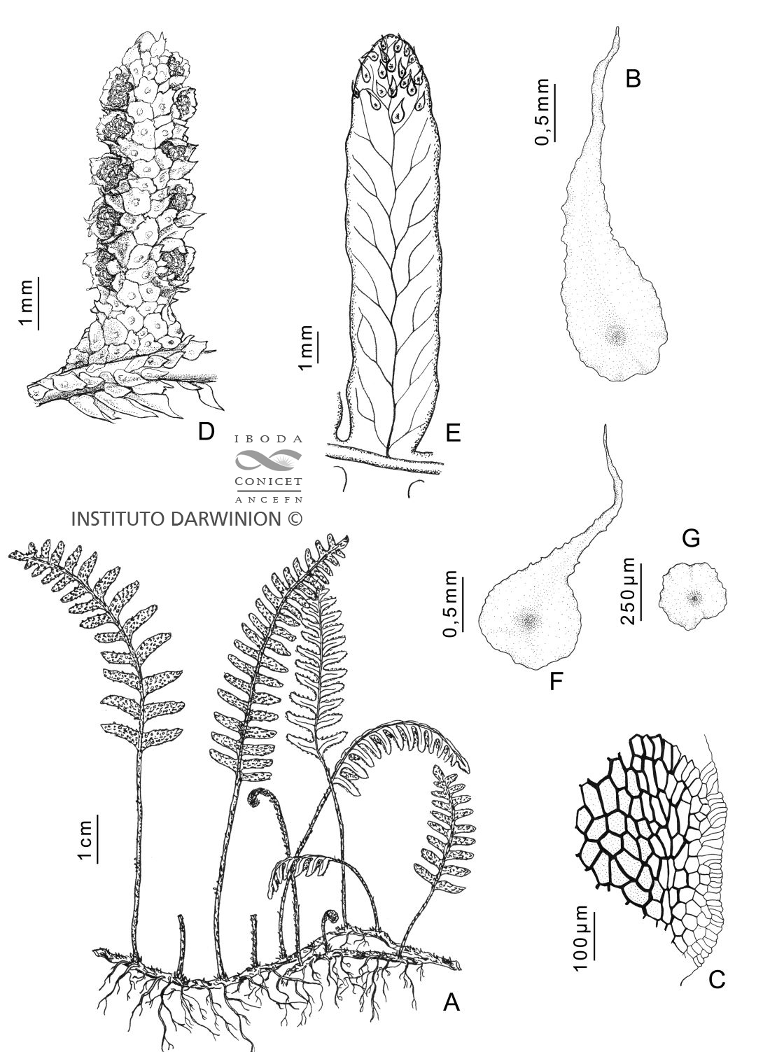 A. Planta. B. Escama rizomática. C. Detalle de la estructura de una escama rizomática. D. Pinna fértil, cara abaxial, mostrando las escamas y los soros. E. Pinna estéril, cara abaxial, mostrando la venación y escamas hacia el ápice. F. Escama de la lámina. G. Escama entre los esporangios.