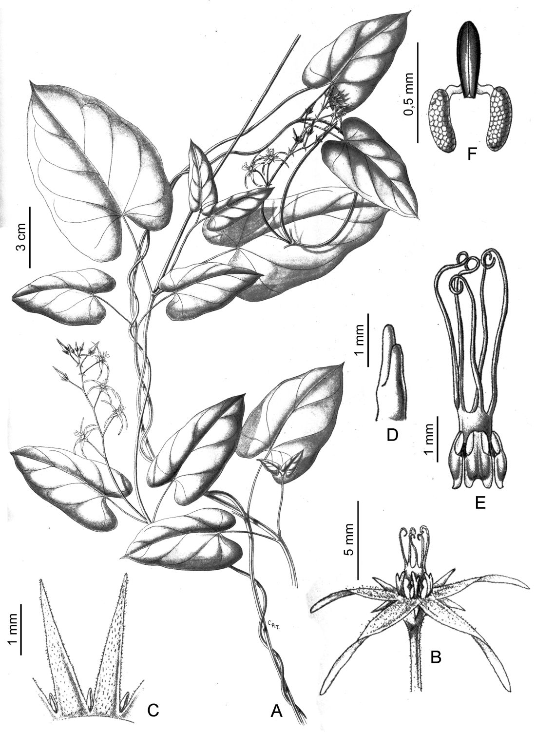 A. Rama florífera. B. Flor. C. Lóbulos del cáliz y coléteres. D. Lóbulo de la corona. E. Ginostegio. F. Polinario. Tomado de Gen. Sp. Pl. Argent. 2: lámina 60. 1944.