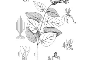 Voluble, ramas teretes de 1,5 mm de diámetro, pubérula. Hojas con pecíolo de 3-6 mm de largo, pubérulo; lámina anchamente oblonga a ovado-oblonga, de 2,5-4 × 1-2 cm, ápice acuminado a mucronado, base profundamente cordada, cara abaxial pubérula a pubescente, cara adaxial glabrescente. Inflorescencias corimbiformes, multifloras, pedúnculo de 0,5-1 cm de largo, pubérulo. Flores con pedicelo de 0,5-1 cm de largo, pubérulo a pubescente; cáliz con lóbulos lanceolados, de 2,5 × 0,5 mm, externamente pubérulos, cara interna glabra con un coléter en el seno; corola con tubo campanulado, lóbulos linear-lanceolados, de 5-6 × 2 mm, patentes a reflexos, cara externa pubescente, cara interna papilosa con base barbada; corona con lóbulos de 1,5 mm de largo, 2-labiados con un apéndice interno que alcanza el ápice; ginostegio subsésil de 1,5 mm de largo, con apéndice de la cabeza estilar conformado por 5 lacinias filiformes de 4 mm de largo, blanco; anteras cuadrangulares, de 1 mm de largo, con membrana apical suborbicular de 0,4 mm de diámetro; polinarios con el retináculo oblongo, de 0,4 × 0,12 mm, caudículas de 0,09 mm de largo, horizontales, edentadas, polinios ovoides, de 0,35 × 0,12 mm. Frutos y semillas no vistos.