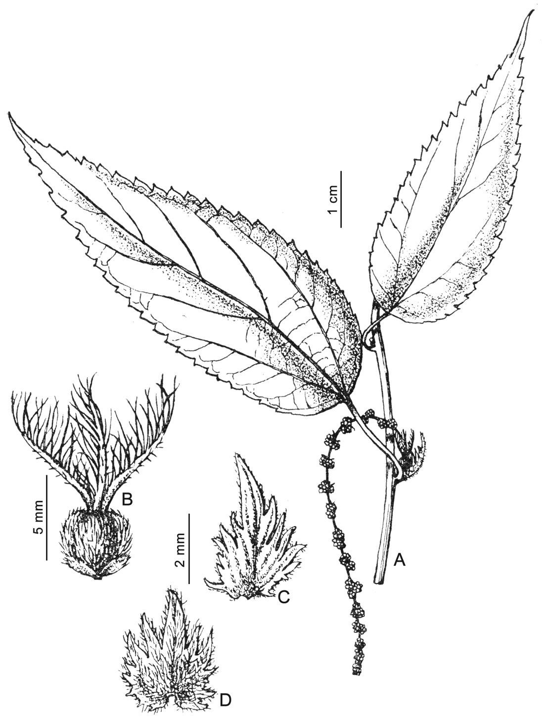 Arbusto o arbolito de 2-5 m de alto; ramas jóvenes adpreso-pubescentes, glabrescentes; entrenudos de 2-5 cm de largo. Hojas con pecíolos de 0,5-3,5 cm de largo, pubescentes; estípulas lineares, de 5-8 mm de largo, pubescentes; lámina foliar estrechamente ovada u ovado-lanceolada, de 5-12 × 2-6 cm, ápice acuminado, base redondeada, a veces estrecha, margen fino a gruesamente aserrado; cara adaxial glabrescente, cara abaxial con tricomas hirsutos sobre las nervaduras; nerviación pinnatipalmada, con 3(-5) nervios en la base y 6-8 pares de nervios secundarios, membranácea. Inflorescencias andróginas y estaminadas de 3-16 cm de largo, espiciformes, axilares, con numerosas flores estaminadas apretadas y una bráctea pistilada en la base, a veces también brácteas pistiladas solitarias; brácteas pistiladas ovado-lanceoladas, de 3-12 mm de largo, con dientes notables, el central más largo, acrescentes en el fruto, con algunos tricomas hirsutos en ambas caras, margen palmatipartido, con ca. 7 dientes profundos, con el diente central prominente. Flores pistiladas solitarias en cada bráctea, sésiles; sépalos 3, ovados, pubescentes; ovario muricado, hirsuto-pubescente; estilos gruesos, pinnatilaciniados, con algunos tricomas en el dorso. Fruto una cápsula ca. 3 mm de diámetro, pubescente, ligeramente muricada. Semillas finamente foveoladas.