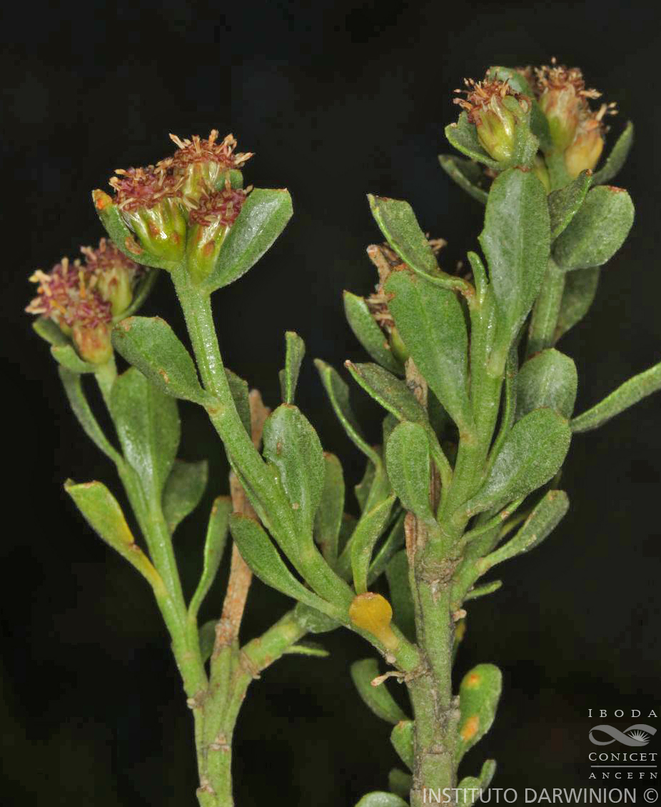 Arbustos bajos, de 10-30 cm de alto, revestidos por nidos pilosos. Hojas sésiles, angostamente obovadas a cuneiformes, de 1-2,5 cm × 3-5 mm, agudas u obtusas en el ápice y atenuadas o cuneadas en la base, enteras o con 1-3 dientes a cada lado delmargen, en apariencia 1-nervadas. Capítulos sésiles en la axila de las hojas superiores, formando una espiga o glomérulo folioso terminal. Capítulos pistilados con involucro acampanado de 4- 6 × 4 mm; filarios en 3-4 series, obtusos o subobtusos, los exteriores ovados y los interiores angostamente ovados. Flores ca. 30; corolas de 3-4 mm de largo, de ápice irregularmente dentado o laciniado. Aquenios ca. 1,2 mm de largo, 5-costados, glabros. Papus 2-seriado, apenas acrescente. Capítulos estaminados con involucro acampanado de 4-5 × 3-4 mm; filarios en 3 series, obtusos o subobtusos, los exteriores ovados, los intermedios oblongos y los interiores angostamente oblongos. Flores 21-29; corolas de 3-4,2 mm de largo; estilo con ramas cortas y pegadas entre sí. Papus con cerdas ensanchadas en el ápice.