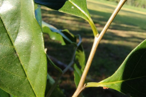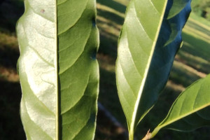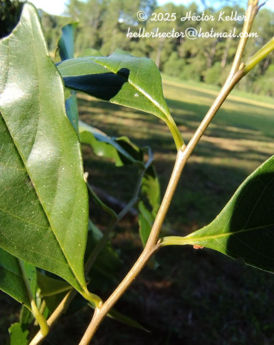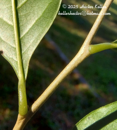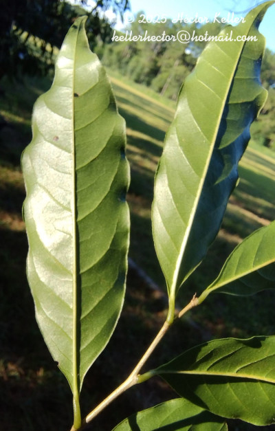 Árboles de 5-15 m de alto; ramas de 5-10 mm de diámetro, cuando jóvenes glabras a esparcidamente pubescentes; entrenudos de 0,5-3,2 cm de largo. Hojas con pecíolos de 0,3-1,7 cm de largo, pubescentes a glabros; láminas generalmente obovado-lanceoladas, oblongo-lanceoladas o estrechamente elípticas, de 8,5-23 × 1,8-6,7 cm, de base aguda, ápice, en general, agudo-acuminado o agudo-caudado, bordes conspicuamente revolutos, de color negro o castaño y con brillo metálico cuando secas, glabras; agallas cupuliformes, más anchas que altas, frecuentemente presentes en el epifilo, con 6-12 pares de venas secundarias. Inflorescencias en ripidios de 2,5-16 mm de largo × 0,5-0,8 mm de diámetro basal y de 1-2,5 mm de diámetro apical, opositifolias o extraaxilares, con 1-3 flores; pedicelos glabros a esparcidamente pubescentes; bractéolas deltoides, de 1 × 0,8 mm. Flores amarillas; cáliz con 3 sépalos libres, conspicuamente carenados, deltoides, de 2,5-3 × 2-3 mm, de ápice agudoacuminado, base truncada, externamente pubescentes, internamente glabros; corola compuesta por 6 pétalos, connados en la base, formando un tubo basal corto, de 2,5-5 mm de diámetro, externamente esparcida a densamente pubescentes e internamente glabros, carnosos, dispuestos en 2 verticilos, el verticilo externo compuesto por pétalos con proyecciones aliformes elípticas, obovado-orbiculares a ovaladas, patentes, ascendentes o inclinadas hacia abajo, comprimidas longitudinalmente, de 5-7 mm de largo × 3,5-5 mm de altura en su parte más ancha y de 0,5-2 mm de espesor en la base, el verticilo interno con pétalos reducidos, de 1,5-2,5 mm de alto × 2-3 mm de ancho en la parte libre y de 0,5-2 mm de alto × 1-2,8 mm de ancho en la parte connada, densamente pubescentes en la cara externa, internamente glabros; androceo compuesto por 130-150 estambres de disposición espiralada alrededor del eje floral, de 0,8-1 mm de largo, anteras de 0,7-0,8 mm de largo; gineceo con ca. 70 carpelos libres, glabros, con estigmas capitados conniventes. Frutos globosos, de 2-3,5 cm de alto × 2,8-3,7 cm de ancho, cayendo de las ramas cuando maduros, glabros, sobre pedúnculos de 0,4- 1,8 cm de largo × 1,2-2,5 cm de diámetro, epicarpio generalmente con la superficie lisa o con leves excrecencias convexas, a veces, con arrugas longitudinales, verde oscuros cuando jóvenes, verde claros o amarillentos al madurar, pero sin areolas prominentes, hexagonales o pentagonales. Semillas cuneiformes, de 9-14 × 4-8 mm, castañas a negras, sarcotesta lechosa y ácida en el fruto fresco.