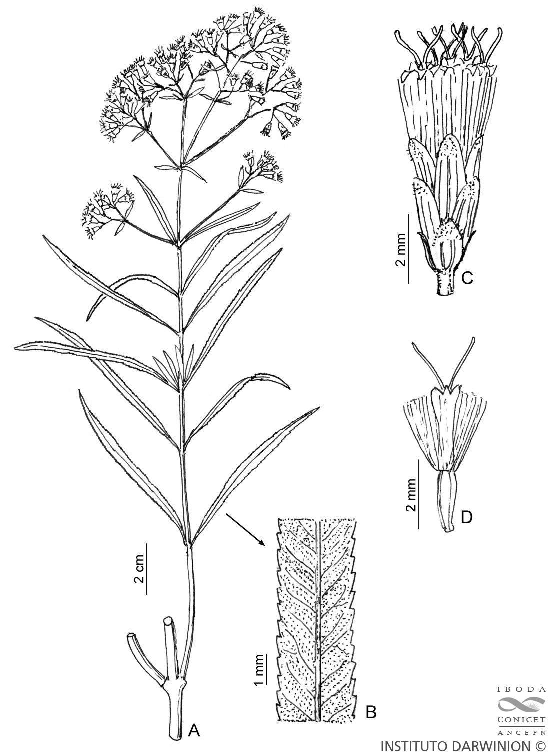 A. Rama florífera. B. Hoja, detalle. C. Capítulo. D. Flor. Tomado de Fl. Paraguay 25: 170, fig. 65. 1996.