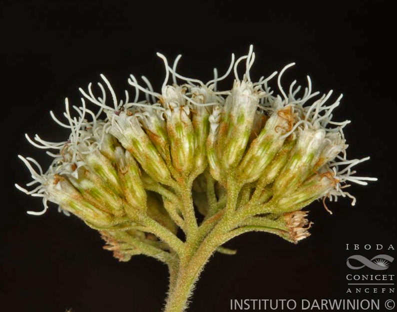 Arbustos de 1-2 m de alto, con ramas densamente hojosas, velutino-tomentosas ó glabrescentes. Hojas cortamente pecioladas, láminas linear lanceoladas, de 4-9 × 0,4-1 cm, cuneiformes en la base, largamente atenuadas en el ápice, menudamente aserradas en el margen, glabras y brillantes en la haz y tomentulosas a glabrescentes en el envés. Capítulos numerosos, dispuestos en cimas corimbiformes densas. Involucro acampanado ca. 4 × 2-2,5 mm; filarios pocos, en 3 series, gradualmente más cortos, los externos ovados, los internos oblongos, redondeados y tomentosos en el ápice. Flores 5, corolas blancas, ca. 2.5 mm de largo. Aquenios ca. 2 mm de largo, ligeramente pilosos. Papus amarillento.