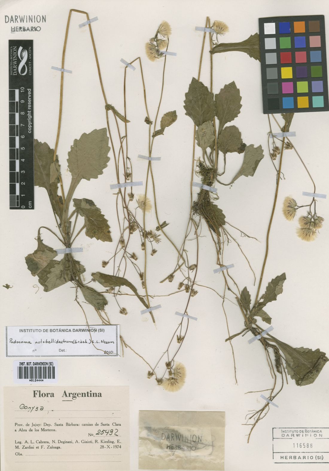 Hierbas hasta de 75 cm de alto, rizomatosas; tallos simples, hojosos en la base, laxamente pilosos a glabros. Hojas glabras o subglabras, las inferiores anchamente obovadas a suborbiculares, de 6-20 × 2-7 cm, base atenuada abruptamente en un pseudopecíolo, abrazadora, ápice agudo a subobtuso y margen distalmente crenado denticulado; las superiores pocas (1 ó 2), oblongas, reducidas, de 1,5-9 × 0,5-4 cm, de base subauriculada, abrazadora, ápice agudo, margen entero. Capítulos 4-35 por eje, ca. 8 × ca. 4 mm. Involucro con filarios dispuestos en 3-5 series, de 2-5 × 0,3-0,5 mm, subglabros. Flores marginales con corola de 5-5,2 mm de largo, limbo de 0,8-1 mm; flores del centro con corolas de 5,5-6 mm de largo. Aquenios de 2-3 × ca. 0,15 mm, laxamente seríceos. Papus de 6-8 mm de largo, formado por 1 serie de cerdas desiguales, ocasionalmente con pocas cerdas muy cortas (de 0,2-0,3 mm de largo).