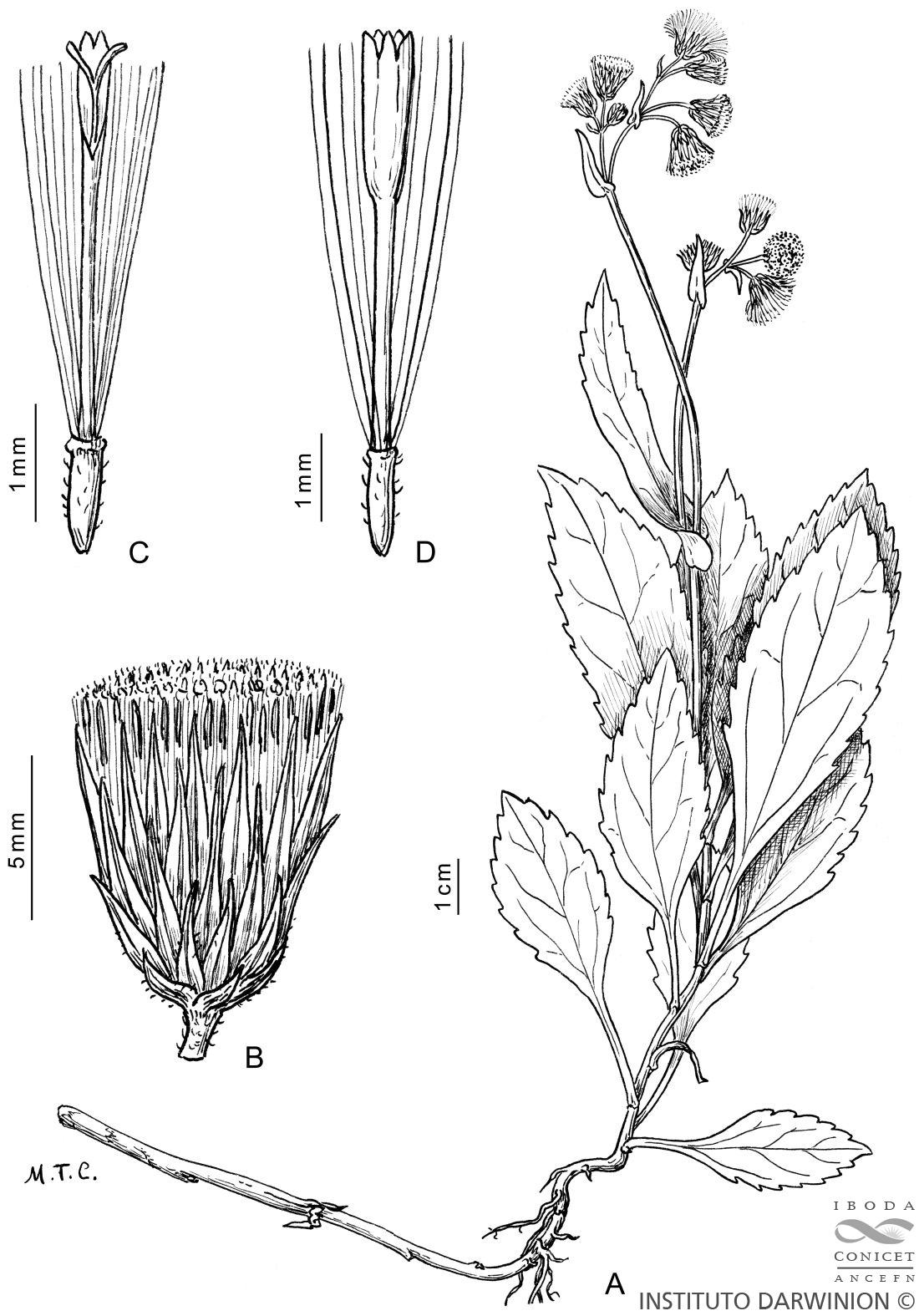 A. Planta. B. Capítulo. C. Flor del margen. D. Flor del centro.