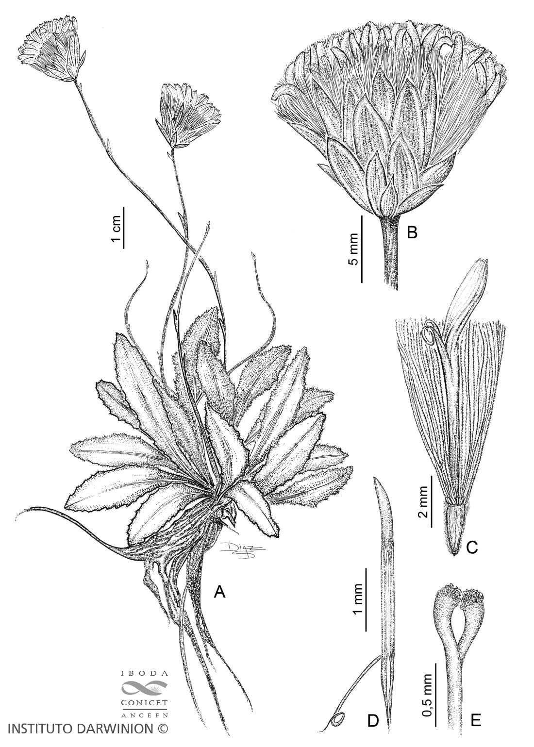 Hierbas acaules, de 5-20 cm alto, glabras. Hojas inferiores dispuestas en roseta o subarrosetadas, sésiles a largamente pecioladas, con pecíolos ensanchados inferiormente en una vaina membranácea; láminas oblanceoladas, de 2-6 × 0,6-1,3 cm, atenuadas en la parte inferior, agudas en el ápice, enteras, sinuadodentadas o irregularmente dentadas en el margen, menudamente ciliadas, glabras en ambas caras; hojas superiores más o menos numerosas, bracteiformes, lineares, lanceoladas u ovadolanceoladas. Capítulos solitarios, sobre 1-6 escapos. Involucro de 10-12 × 8-20 mm; filarios 4-5-seriados, enteros, mucronados en el ápice, con bordes anchos, escariosos, glabros, los externos lanceolados u ovados, los internos lanceolados a oblongos. Flores 28-35, corola azul, las del margen con tubo de 4,5-6 mm de largo, labio exterior de 4-6 mm de largo. Aquenios truncados en el ápice, seríceovelludos, con tricomas blancos. Papus de 7-8 mm de largo, leonado.