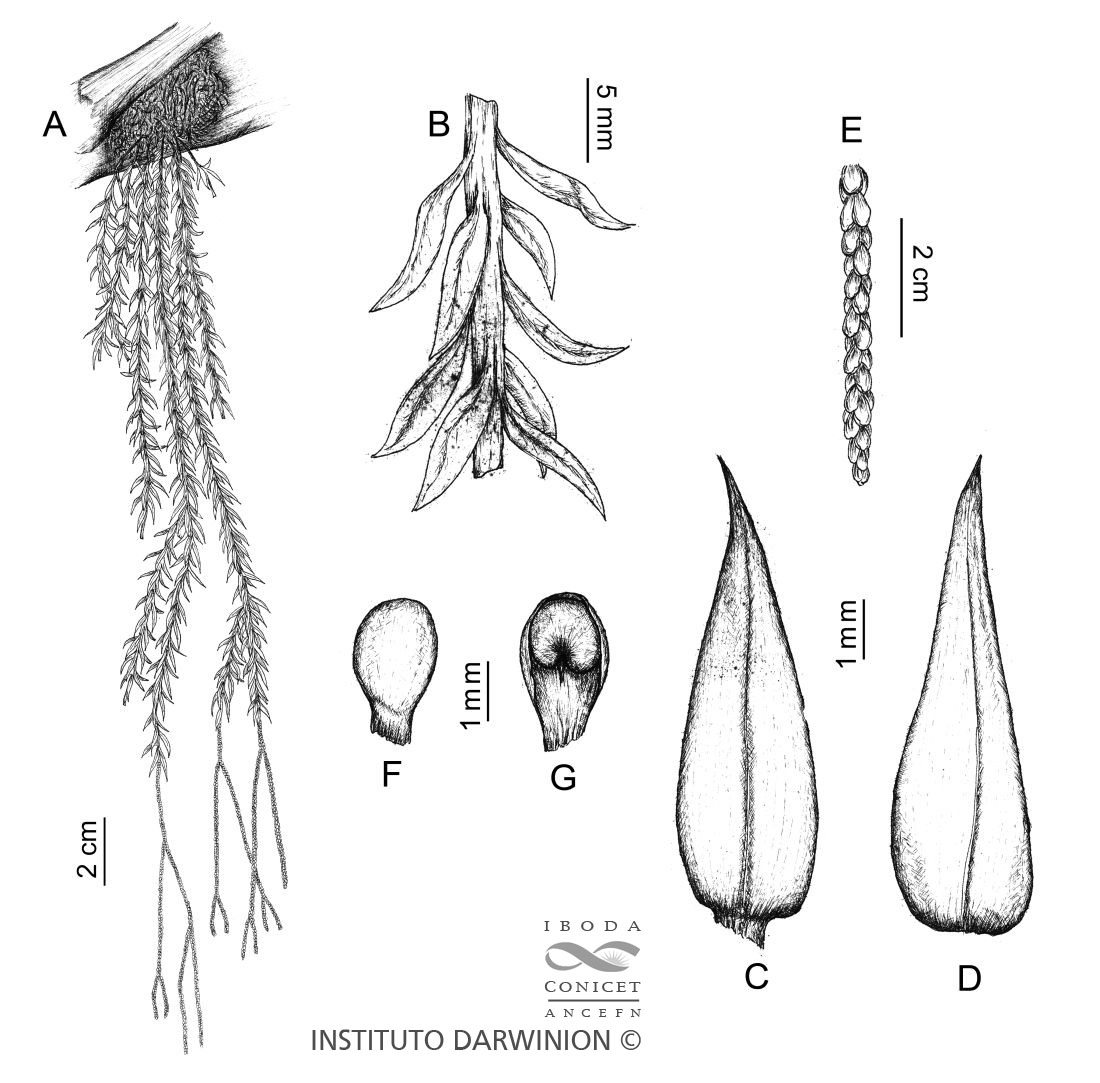 A. Planta. B. Detalle de una rama. C-D. Licofilo, vistas dorsal y ventral respectivamente. E. Porción de un estróbilo. F-G. Esporofilo, vistas dorsal y ventral respectivamente.