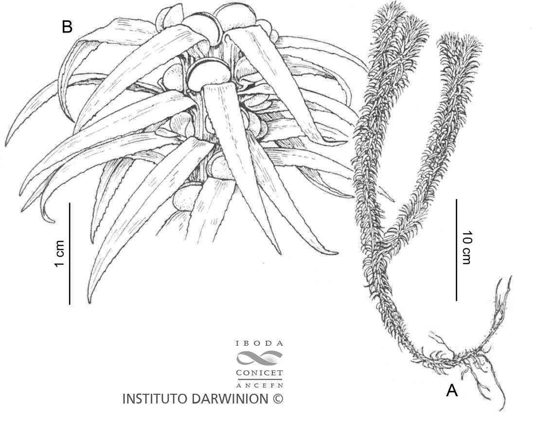 Plantas terrestres, con tallos de porción basal postrada y porción apical erecta, hasta 3-4 veces ramificados, con ramas ascendentes de 10-30(-40) cm de alto, con raíces surgiendo en las porciones postradas. Licofilos de 5-8 × 0,7-1,2 mm, monomorfos, subulados-lineales, ascendentes en las porciones terminales, horizontales hasta deflexos en dirección basípeta, con filotaxis helicoidal o subverticilada, herbáceos y firmes, con bases decurrentes, adaxialmente planos y curvados abaxialmente; márgenes denticulados hasta ciliolados desde el ápice hasta la base, dentículos hialinos, 1-2-celulares, acroscópicamente dirigidos. Esporangios amarillos, de 1,2-1,8 × 0,5-0,8 mm, no cubiertos completamente por los esporofilos.