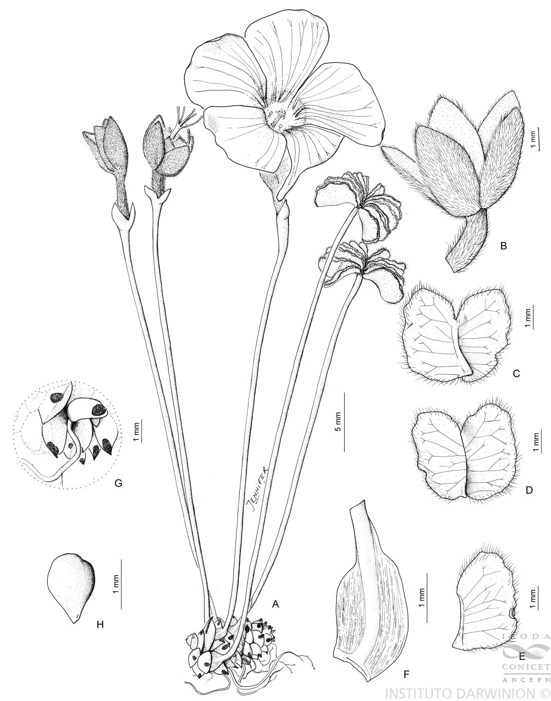 Hierbas acaules, perennes, de 4-5 cm de alto. Raíces adventicias, fibrosas; rizomas horizontales, cilíndricos, delgados, enangostados cada 1-2 cm; escamas nutricias imbricadas espiraladamente, cónicas, de 4 × 2 mm, blanquecinas, suculentas, de sección sub-plano-convexa, mácula anaranjada siempre presente. Hojas 2-7; estípulas hasta de 2 × 2,5 mm, adnatas al pecíolo, enangostadas hacia el ápice; pecíolos de 4-5 cm de largo, glabros; folíolos 10-12, obcordados, de ámbito cuadrado, de 3,5- 4 × 4,5-5 mm, ampliamente emarginados, verdosos, glaucos, de superficie glabra, márgenes ondulados, ciliados. Cimas 1-floras; pedúnculos más largos o iguales que el follaje, glabros; brácteas ovadas, agudas, hasta de 2 mm de largo, hialinas, glabras; pedicelos hasta de 3 mm de largo, pubescentes; sépalos de 5,5 × 2-2,5 mm, externamente pubescentes, internamente glabros. Flores hasta de 40 mm de diámetro; pétalos 3-5 veces el largo de los sépalos, unguiculados, rosados a violáceos, a veces con líneas y la garganta violácea. Cápsulas globosas, de 6-7 mm de diámetro; glabras o con pelos cortos simples o glandulares; carpelos con el interior pubescente, con 1-2 semillas. Semillas elipsoides, de 2 × 1 mm, asimétricas, costadas, ocres.