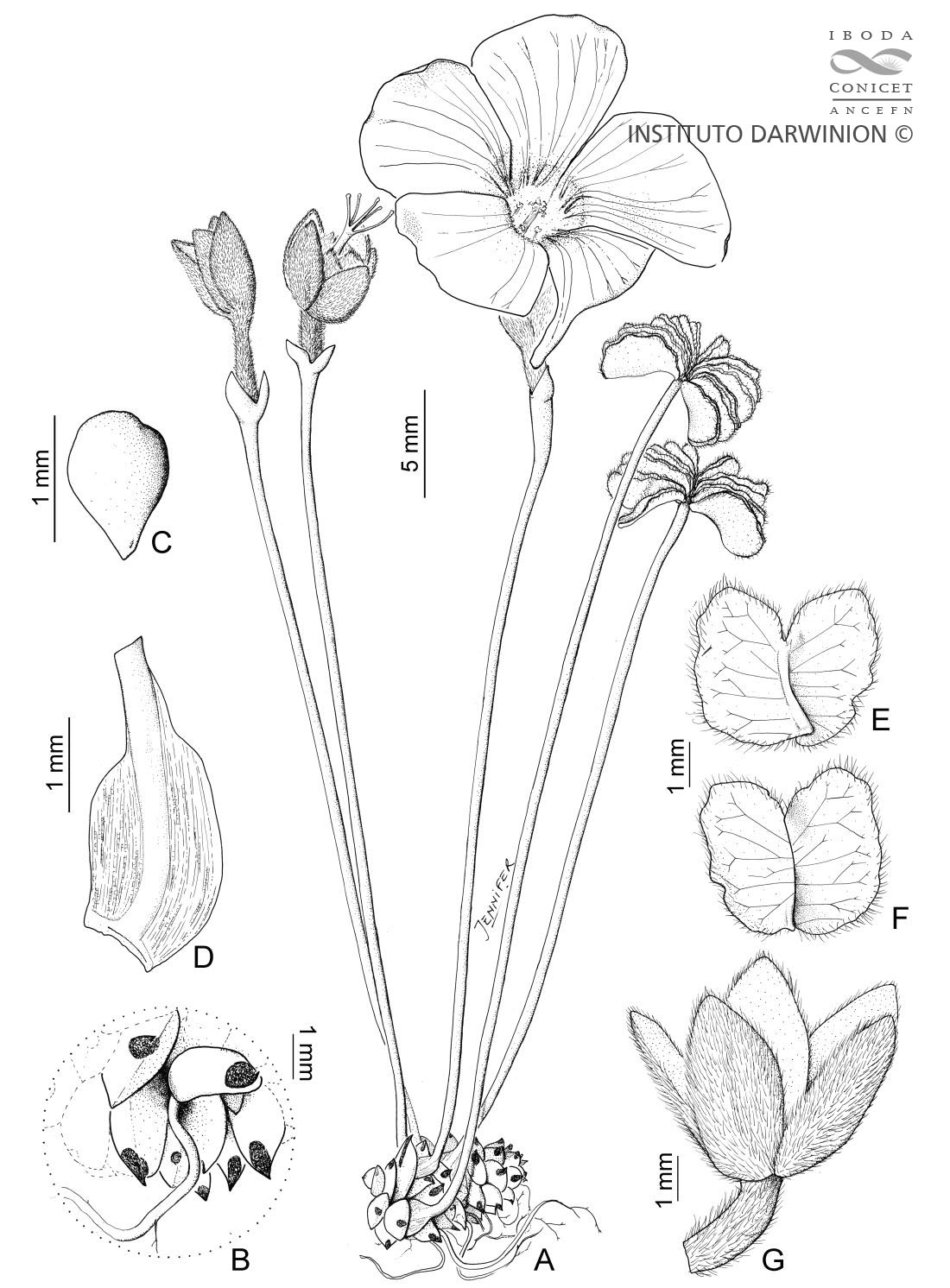 Hierbas acaules, perennes, de 4-5 cm de alto. Raíces adventicias, fibrosas; rizomas horizontales, cilíndricos, delgados, enangostados cada 1-2 cm; escamas nutricias imbricadas espiraladamente, cónicas, de 4 × 2 mm, blanquecinas, suculentas, de sección sub-plano-convexa, mácula anaranjada siempre presente. Hojas 2-7; estípulas hasta de 2 × 2,5 mm, adnatas al pecíolo, enangostadas hacia el ápice; pecíolos de 4-5 cm de largo, glabros; folíolos 10-12, obcordados, de ámbito cuadrado, de 3,5- 4 × 4,5-5 mm, ampliamente emarginados, verdosos, glaucos, de superficie glabra, márgenes ondulados, ciliados. Cimas 1-floras; pedúnculos más largos o iguales que el follaje, glabros; brácteas ovadas, agudas, hasta de 2 mm de largo, hialinas, glabras; pedicelos hasta de 3 mm de largo, pubescentes; sépalos de 5,5 × 2-2,5 mm, externamente pubescentes, internamente glabros. Flores hasta de 40 mm de diámetro; pétalos 3-5 veces el largo de los sépalos, unguiculados, rosados a violáceos, a veces con líneas y la garganta violácea. Cápsulas globosas, de 6-7 mm de diámetro; glabras o con pelos cortos simples o glandulares; carpelos con el interior pubescente, con 1-2 semillas. Semillas elipsoides, de 2 × 1 mm, asimétricas, costadas, ocres.
