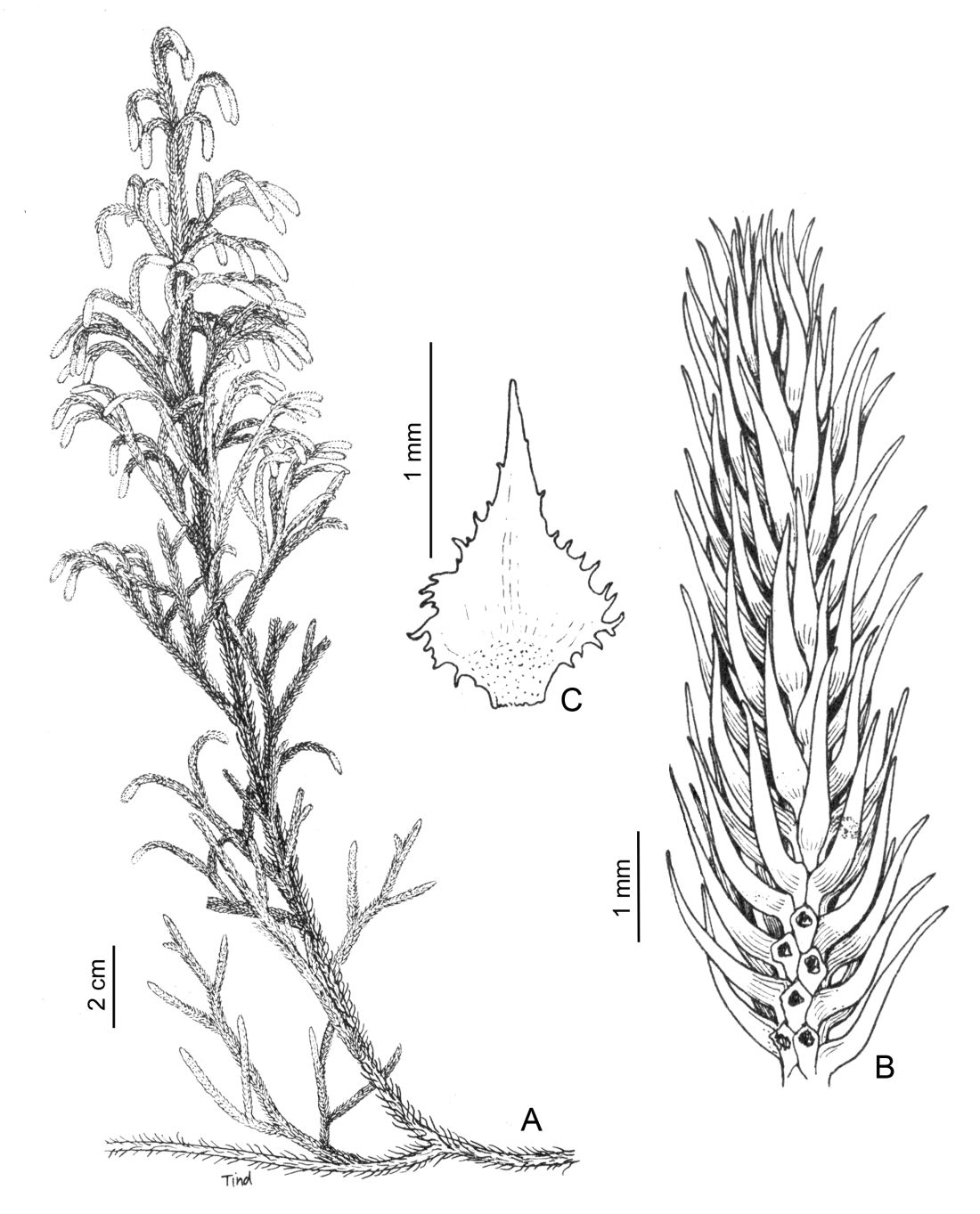 A. Sistema de ejes aéreos. B. Estróbilo (algunos esporofilos basales fueron removidos). C. Esporofilo. Tomado de Bradea 5: 38, fig. 3. 1987 (sub Lycopodiella camporum).