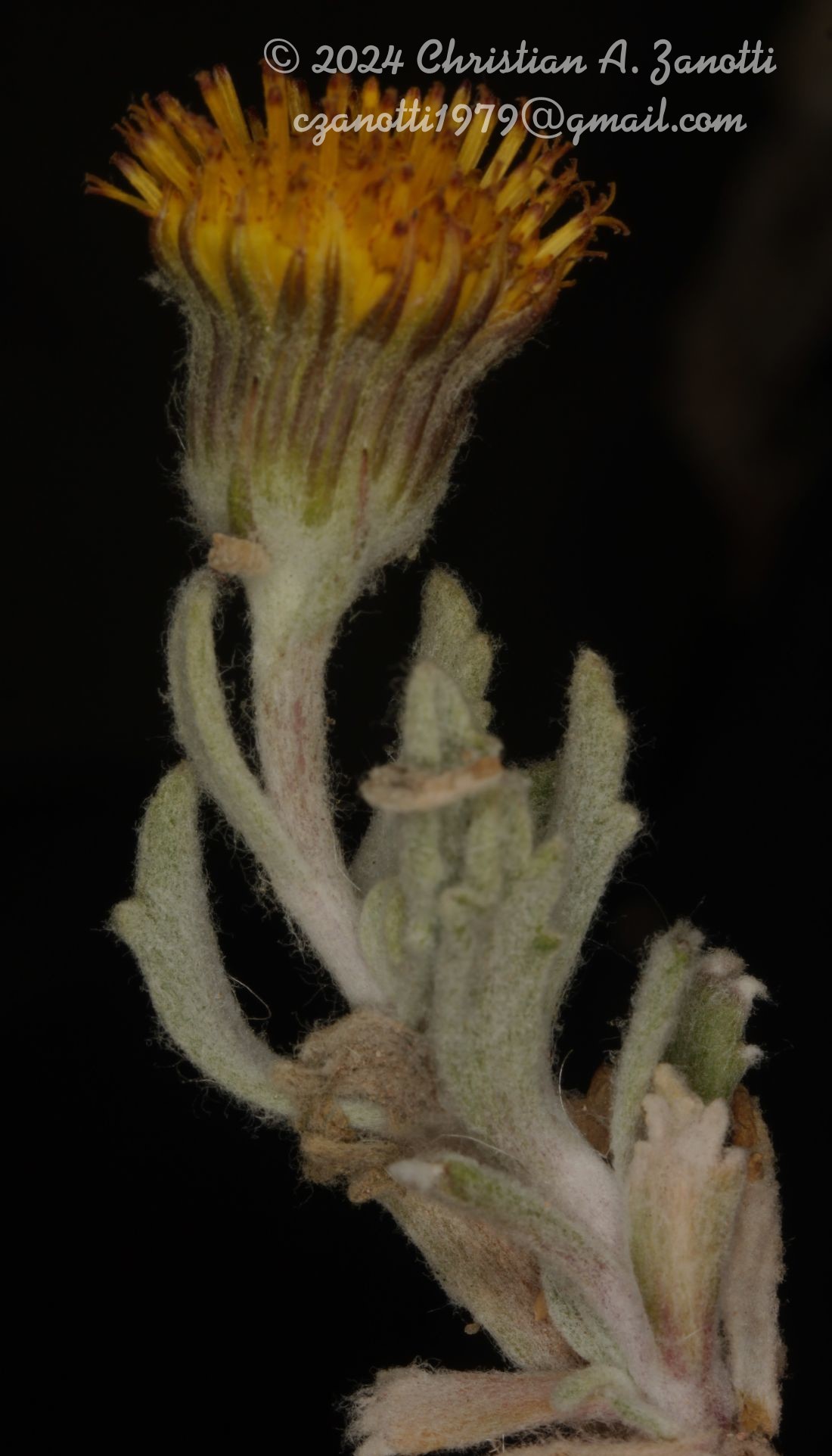Sufrútices bajos, densamente ramosos en la base, de 7-10 cm de alto, gríseo-lanosos; tallos ascendentes, densamente hojosos en la parte inferior y subescapiformes en la superior. Hojas alternas, láminas oblanceolado-espatuladas, de 6-12(18) × 4-8 mm, atenuadas en la base, agudas u obtusas en el ápice, revolutas en el margen, enteras o 3-8(12)-dentadas, tomentosas en ambas caras. Capítulos discoides, solitarios en los extremos de los tallos; pedúnculos de 1-2 cm de largo. Involucro acampanado, de 9-12 × 14-22 mm; brácteas del calículo pocas, linear-triangulares, cortas; filarios 18-22, linear-oblongos, atenuados y penicilados en el ápice, pubescentes en el dorso. Flores isomorfas, numerosas, con corolas amarillas, tubulosas, ca. 7 mm de largo, cortamente 5-lobadas, lóbulos triangulares, de 0,5-0,9 mm de largo. Aquenios cilindroides, ca. 4 mm de largo, 10-costados, cortamente seríceo-pubescentes. Papus blanco de unos 5 mm de largo.