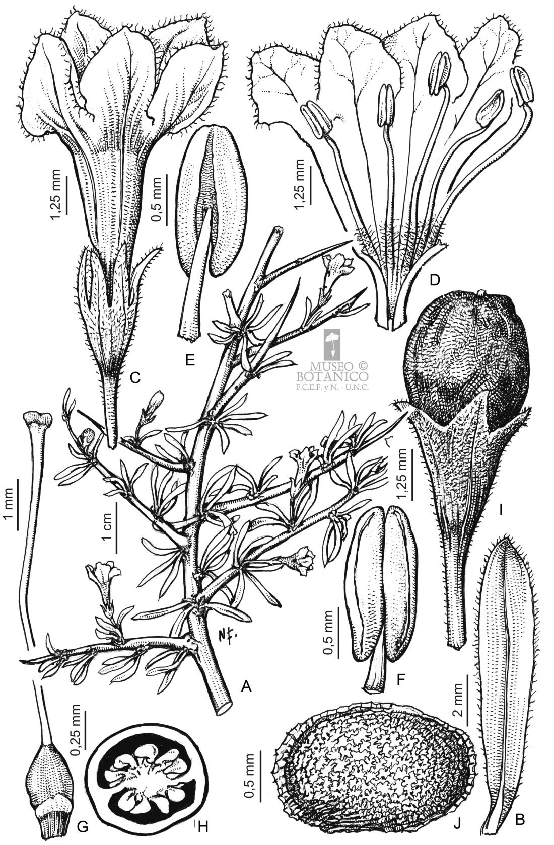 A. Sector de rama florífera. B. Hoja, vista adaxial. C. Flor. D. Corola desplegada. E. Estambre, vista dorsal. F. Estambre, vista ventral. G. Gineceo. H. Ovario, corte transversal. I. Fruto. J. Semilla.