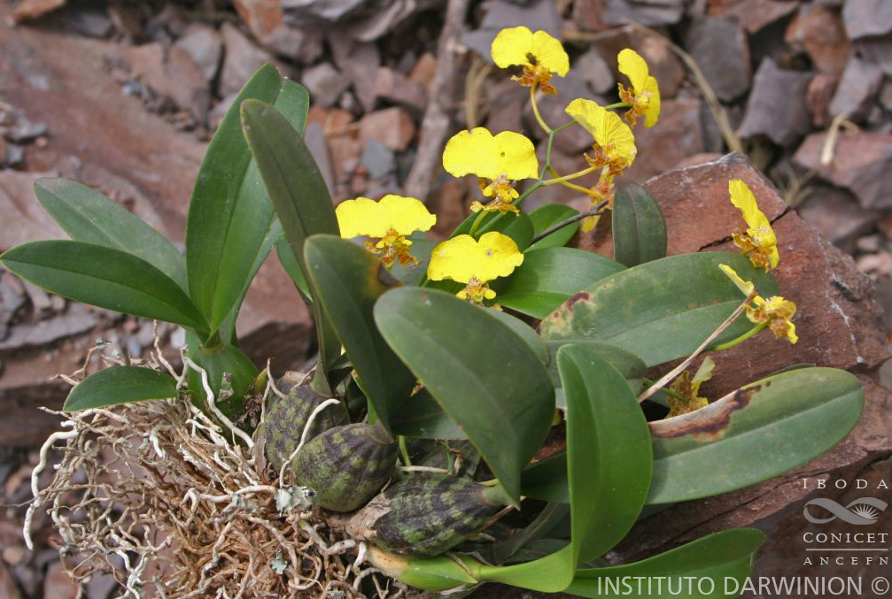 Tubérculo de ± 2-3 cm de largo × 1,5 cm, ovoide, obtuso, tenuemente costillado, verde oscuro con máculas purpúreas a veces dispuestas formando anillos, rodeado de vainas membranáceas tenues, generalmente bifilo. Hojas 5-20 × 1-2 cm, semicoriáceas, lanceoladas, planas, cortamente conduplicadas en la base, arqueadas y, con frecuencia, con un movimiento helicoidal. Escapo de ± 30-45 cm de largo, seminutante, simple, con 1-2 brácteas de 4-8 mm de largo, triangulares, agudas, espaciadas. Inflorescencia simple, con 1, a veces 2, ramificaciones.de ± 12-35 cm de largo, laxa, con flores pediceladas, amarillas con máculas purpúreas o pardo-rojizas. Sépalo dorsal de ± 8 × 3-4 mm, oblongo-elíptico, cortamente unguiculado, obtuso, pero con un pequeño ápice agudo; sépalos laterales de ± 9-11 × 3-4 mm, elípticos, cóncavos, unidos ± 1/3 del largo, aunque a veces casi libres, ondeados, amarillos con grandes máculas pardo-rojizas. Pétalos de ± 10 × ca. 5 mm, angostados en la base, de borde ondeado, obtusos, desplegados. Labelo de (12) 15-25 (30) × 15-30 mm, trilobado, lóbulos laterales de 4-6 × ca. 2 mm, oblongos, obtusos, amarillos, formando un seno amplio con el lóbulo central; éste de 15-25 (42) × 10-30 mm, transversalmente arriñonado, suavemente bilobado, escotado, con un pequeño mucrón en el centro, amarillo, en la zona interlobular el disco presenta una serie de apéndices prominentes, amarillos, que contrastan con la base pardo-rojiza del disco, el amplio seno interlobular es entero, aunque, a veces, algo subdentado. Columna de ca. 5 mm de largo, glabra, carnosa, auriculada; antera opercular, glabra, crestada; polinario con dos polinios globosos amarillos y cartilaginosos unidos por una caudícula hialina a un viscidio oscuro.