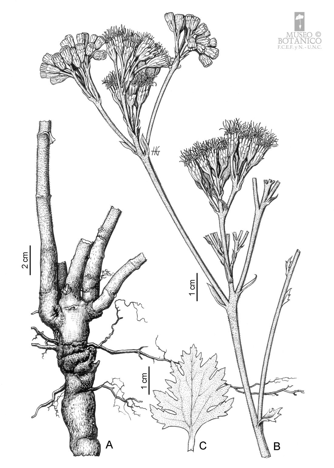 Subarbustos de 50 cm de alto, con xilopodio grueso y tallos ramosos en la base, densamente pubescentes. Hojas alternas, brevemente pecioladas, láminas profundamente lobadas, de 3-5 × 2-4 cm, con lóbulos enteros o dentados, densamente pubescentes en ambas caras. Capítulos numerosos, dispuestos en cimas corimbiformes densas. Involucro acampanado, de 5 × 4,5 mm; filarios dispuestos en 2-3 series, oblongos, obtusos o redondeados en el ápice, densamente pubescentes en la porción superior, los externos de 3 × 0,5 mm, los internos de 5 × 0,5 mm. Flores 10-16; corola blanca o rosada, de 4,7 mm de largo. Anteras de 1,8-2,1 mm de largo. Aquenios de 2,2 × 0,5-0,6 mm, principalmente híspidos sobre las costillas, con numerosos pelos gemelos y escasos pelos glandulares, levemente estipitado en la base. Papus de 3,5 - 4,2 mm de largo.