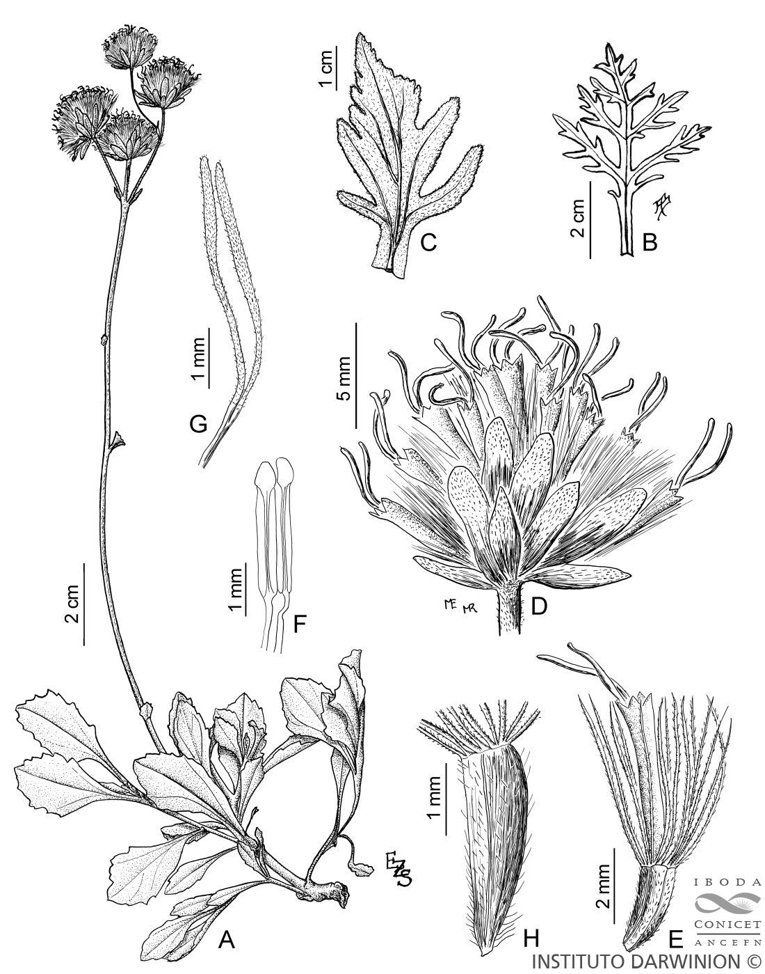 Hierbas perennes de 30-60 cm de alto, con xilopodio globoso y tallos ascendentes o erectos, hojosos en la parte inferior. Hojas inferiores opuestas, láminas ovadas u obovadas, de 2-6,5 × 0,8- 3 cm, irregularmente dentadas o lobuladas, las superiores alternas, más profundamente lobadas o pinnatífidas, con lóbulos anchos, laxamente pubescentes en ambas caras. Capítulos numerosos, dispuestos en cimas corimbiformes densas. Involucro acampanado, de 7-9 × 10-11 mm; filarios dispuestos en 2-3 series, gradualmente más cortos, oblongos, obtusos o redondeados en el ápice, densamente pubescentes en la porción superior, los externos de 3,5-4 × 0,5 mm, los internos de 5,5-6 × 0,5 mm. Flores 10-16; corola blanca o rosada, de 4,5-5 mm de largo. Anteras de 1,9-2,2 mm de largo. Aquenios de 2,7 × 0,6-0,8 mm, con numerosos pelos gemelos y algunos pelos glandulares, estipitados en la base. Papus de 4-4,5 mm de largo.
