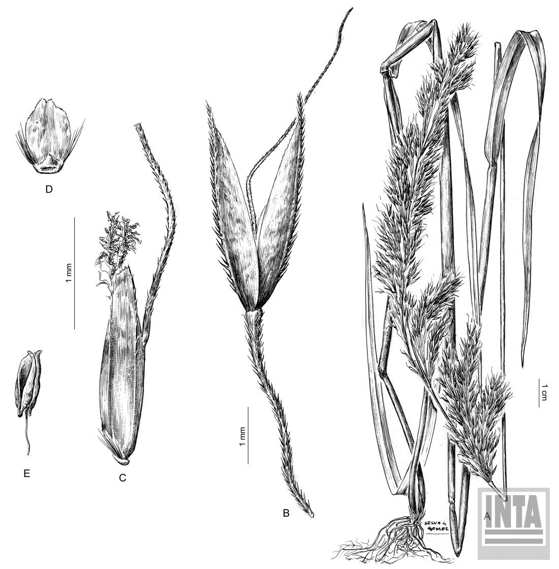 A. Planta. B. Espiguilla. C. Antecio. D. Pálea. E. Estambre.