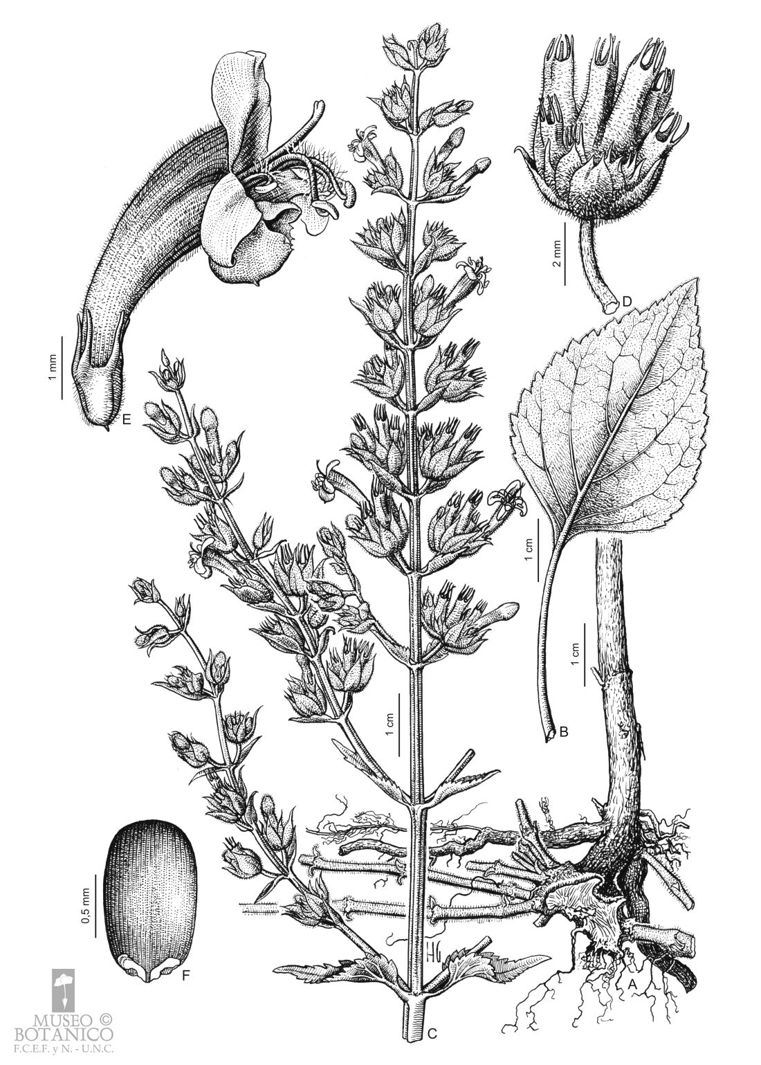 A. Sector basal de planta. B. Hoja. C. Rama florífera. D. Inflorescencia parcial. E. Flor, vista lateral. F. Núcula.