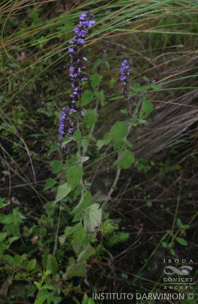 Hierbas erectas, aromáticas, de 1-2 m de alto, casi glabras a pubescentes, con algunos pelos glandulares. Hojas con pecíolos de 1-2,5(-5,2) cm de largo; láminas ovadas u ovado-rómbicas, de 2,5-8 × 1,5-5 cm, base truncada o atenuada, ápice agudo a acuminado, margen simple o doblemente serrado, crenado, cara adaxial subglabra, ligeramente pilosa, con pelos disperos y algunos pelos glandulares, cara abaxial con pubescencia variable, desde villosas a subglabras. Flores subsésiles, reunidas en cimas ca. 15- floras, brevemente pedunculadas, pedúnculos de 2-5 mm de largo, rodeadas por bractéolas a modo de involucro, adpresas y rígidas, obovadas, de 3,5-4 mm de largo, acuminadas. Las cimas se agrupan formando panículas elongadas, con ramas ascendentes. Cáliz de 2 mm de largo, y hasta de 8 mm en fructificación, con pelos finos y otros glandulares; dientes subulados, rígidos, de 0,5-1,5 mm de largo, separados por senos con pelos largos y rígidos. Corola blanca, celeste o azul, de 5-6 mm de largo, tubo ligeramente curvo o largamente cilíndrico, labio inferior con lóbulo central sacciforme. Estambres exertos. Estigma de 7 mm, ramas subiguales. Clusas elipsoides, de 1,5 mm, lisas, castaño-oscuras.