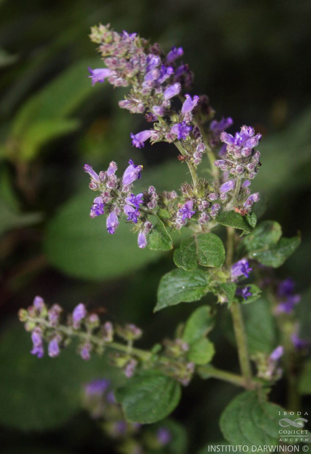 Hierbas erectas, aromáticas, de 1-2 m de alto, casi glabras a pubescentes, con algunos pelos glandulares. Hojas con pecíolos de 1-2,5(-5,2) cm de largo; láminas ovadas u ovado-rómbicas, de 2,5-8 × 1,5-5 cm, base truncada o atenuada, ápice agudo a acuminado, margen simple o doblemente serrado, crenado, cara adaxial subglabra, ligeramente pilosa, con pelos disperos y algunos pelos glandulares, cara abaxial con pubescencia variable, desde villosas a subglabras. Flores subsésiles, reunidas en cimas ca. 15- floras, brevemente pedunculadas, pedúnculos de 2-5 mm de largo, rodeadas por bractéolas a modo de involucro, adpresas y rígidas, obovadas, de 3,5-4 mm de largo, acuminadas. Las cimas se agrupan formando panículas elongadas, con ramas ascendentes. Cáliz de 2 mm de largo, y hasta de 8 mm en fructificación, con pelos finos y otros glandulares; dientes subulados, rígidos, de 0,5-1,5 mm de largo, separados por senos con pelos largos y rígidos. Corola blanca, celeste o azul, de 5-6 mm de largo, tubo ligeramente curvo o largamente cilíndrico, labio inferior con lóbulo central sacciforme. Estambres exertos. Estigma de 7 mm, ramas subiguales. Clusas elipsoides, de 1,5 mm, lisas, castaño-oscuras.