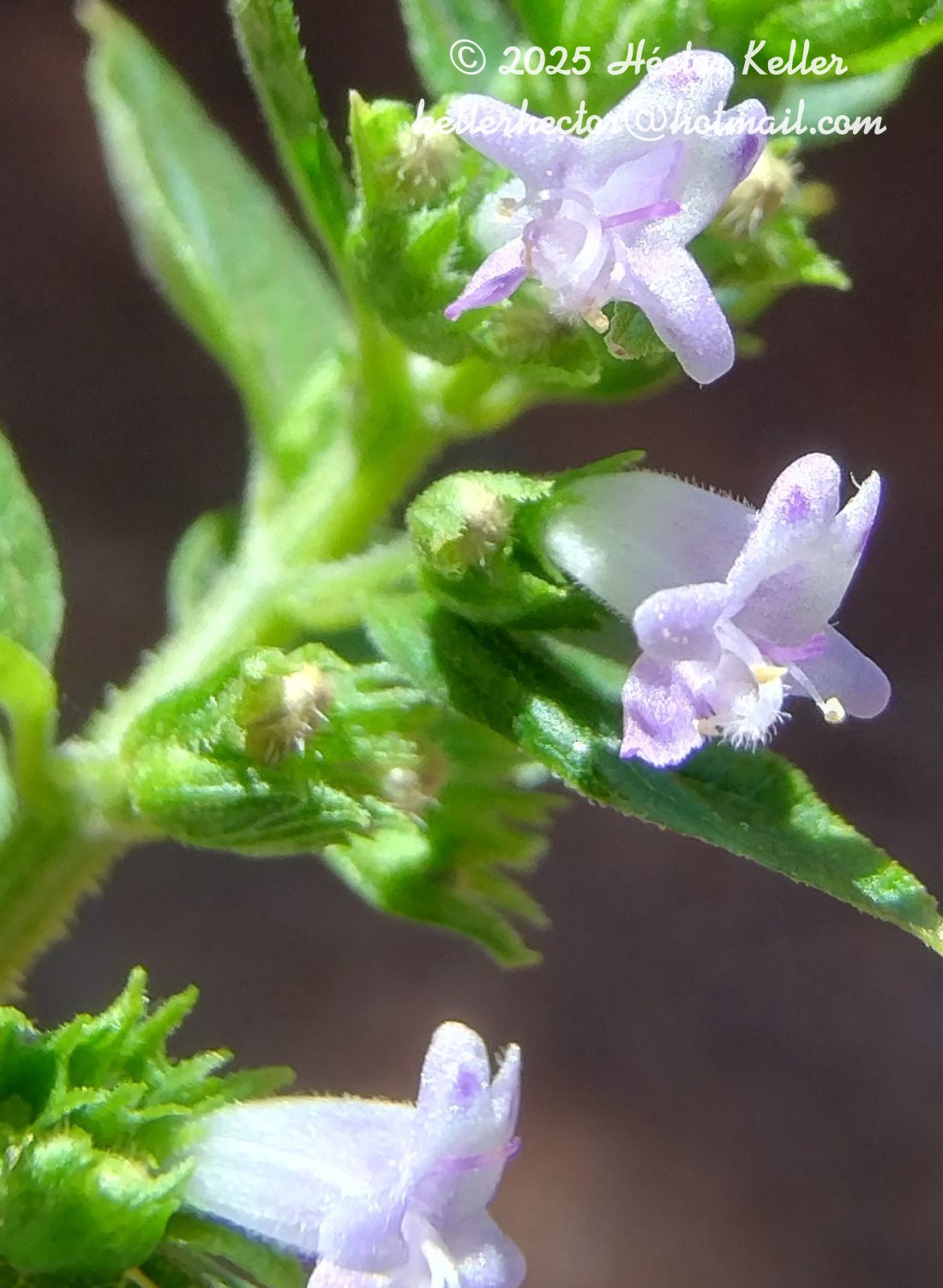 Hierbas erectas, aromáticas, de 1-2 m de alto, casi glabras a pubescentes, con algunos pelos glandulares. Hojas con pecíolos de 1-2,5(-5,2) cm de largo; láminas ovadas u ovado-rómbicas, de 2,5-8 × 1,5-5 cm, base truncada o atenuada, ápice agudo a acuminado, margen simple o doblemente serrado, crenado, cara adaxial subglabra, ligeramente pilosa, con pelos disperos y algunos pelos glandulares, cara abaxial con pubescencia variable, desde villosas a subglabras. Flores subsésiles, reunidas en cimas ca. 15- floras, brevemente pedunculadas, pedúnculos de 2-5 mm de largo, rodeadas por bractéolas a modo de involucro, adpresas y rígidas, obovadas, de 3,5-4 mm de largo, acuminadas. Las cimas se agrupan formando panículas elongadas, con ramas ascendentes. Cáliz de 2 mm de largo, y hasta de 8 mm en fructificación, con pelos finos y otros glandulares; dientes subulados, rígidos, de 0,5-1,5 mm de largo, separados por senos con pelos largos y rígidos. Corola blanca, celeste o azul, de 5-6 mm de largo, tubo ligeramente curvo o largamente cilíndrico, labio inferior con lóbulo central sacciforme. Estambres exertos. Estigma de 7 mm, ramas subiguales. Clusas elipsoides, de 1,5 mm, lisas, castaño-oscuras.