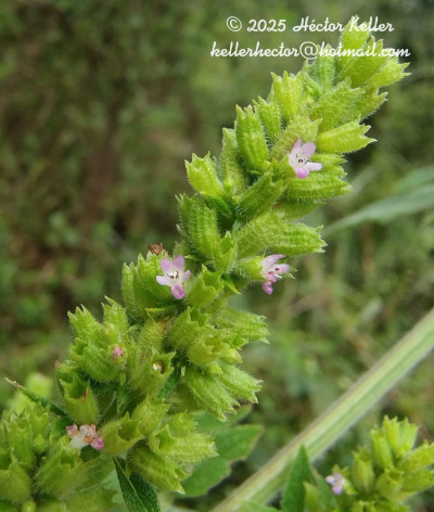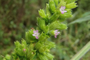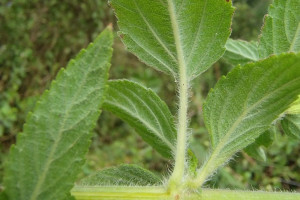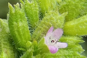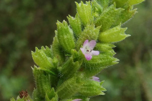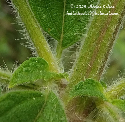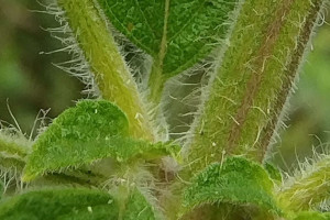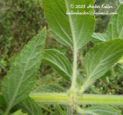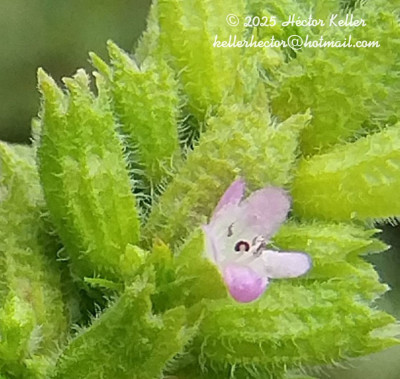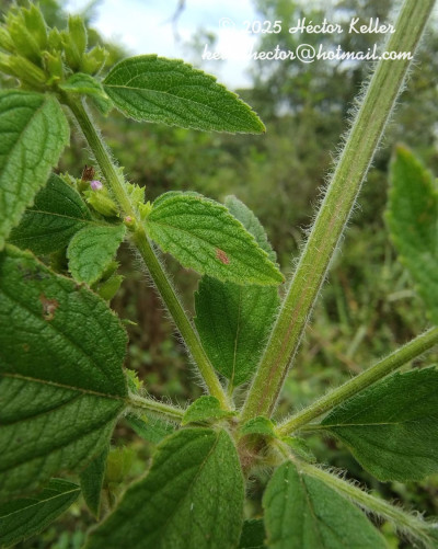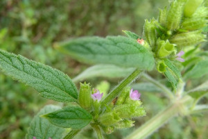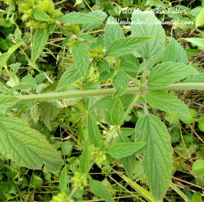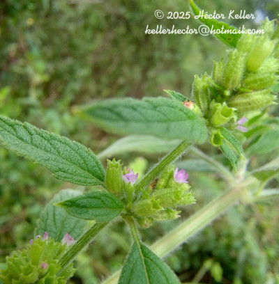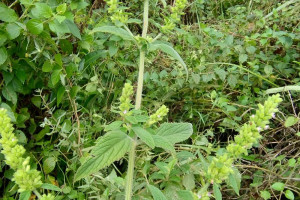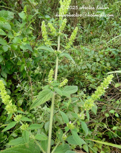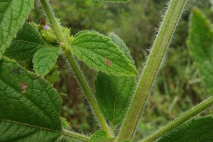 Hierbas perennes, hasta de 1,5 m de alto. Hojas con pecíolo de 1-3 cm de largo; lámina ovada, de 3-8 × 2-4 cm, base truncada o cordada, ápice agudo, margen irregularmente serrado, superficie abaxial híspida, superficie adaxial escabrosa. Flores sésiles o con pedicelo corto, hasta de 2 mm de largo, dispuestas en verticilastros 4-8-floros, axilares, formando pseudoespigas densas; brácteas insconspicuas. Cáliz de 2,5-4 mm de largo, con 5 dientes triangulares; corola blanca o violeta, de 3 mm largo, labio superior de 1 mm de largo, 2-lobado, labio inferior de 1-2 mm de largo, 3-lobado; estilo de 2,5-3,5 mm de largo. Clusas elipsoides ca. 1,5 mm de largo, castañas.