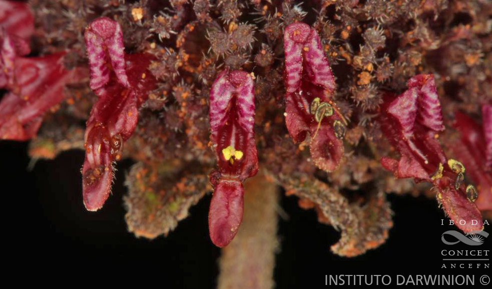 Hierbas perennes, hasta de 50 cm de alto, con raiz xilopodífera; tallos con híspidos a estrigosos. Hojas sésiles; láminas elíptico- ovadas, de 4-10 × 2-7 cm, base redondeada, ápice obtuso, margen regularmente crenado-serrado, estrigosas en la cara adaxial e hispido-estrigosas sobre las nervaduras de la cara adaxial, nervaduras muy conspicuas. Capítulos globosos, de 1,5-2,5 cm de diámetro, multifloros, solitarios; pedúnculos largos, de 15-35 cm de largo, densamente villosos; bractéolas involucrales anchamente ovadas, de 6-10 × 6 mm, muchas veces coloreadas, glabras en la cara interna, pilosas en la externa, nervadura media prominente, margen ciliado. Flores sésiles, cáliz de 4-6 mm de largo, hasta de 10 mm en la fructificación, subglabro externamente, internamente glabro, margen ciliado, dientes del cáliz deltoides, ca. 1,5 mm de largo, con ápice ensanchado en apéndice foliaceo orbicular con margenes pilosos; corola morada, de 6-7 mm de largo. Clusas ovoides ca. 1,2 mm de largo, castaño-claras, lisas, glabras.