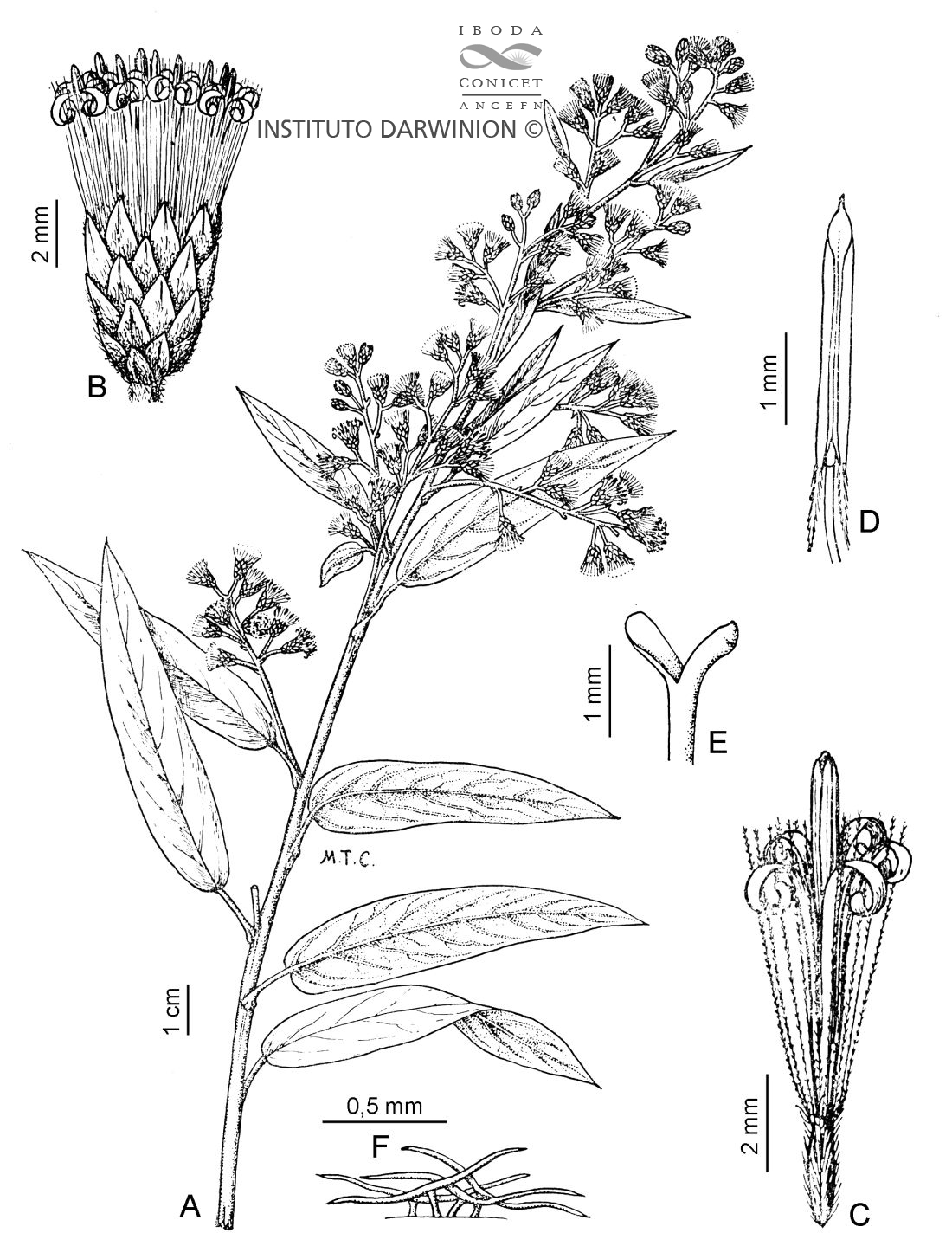 A. Rama florífera. B. Capitulo. C. Flor. D. Estambre. E. Parte superior del estilo. F. Detalle de la pubescencia. Tomado de Revista Mus. La Plata 12 (Bot. 66): 120, fig. 29. 1971.