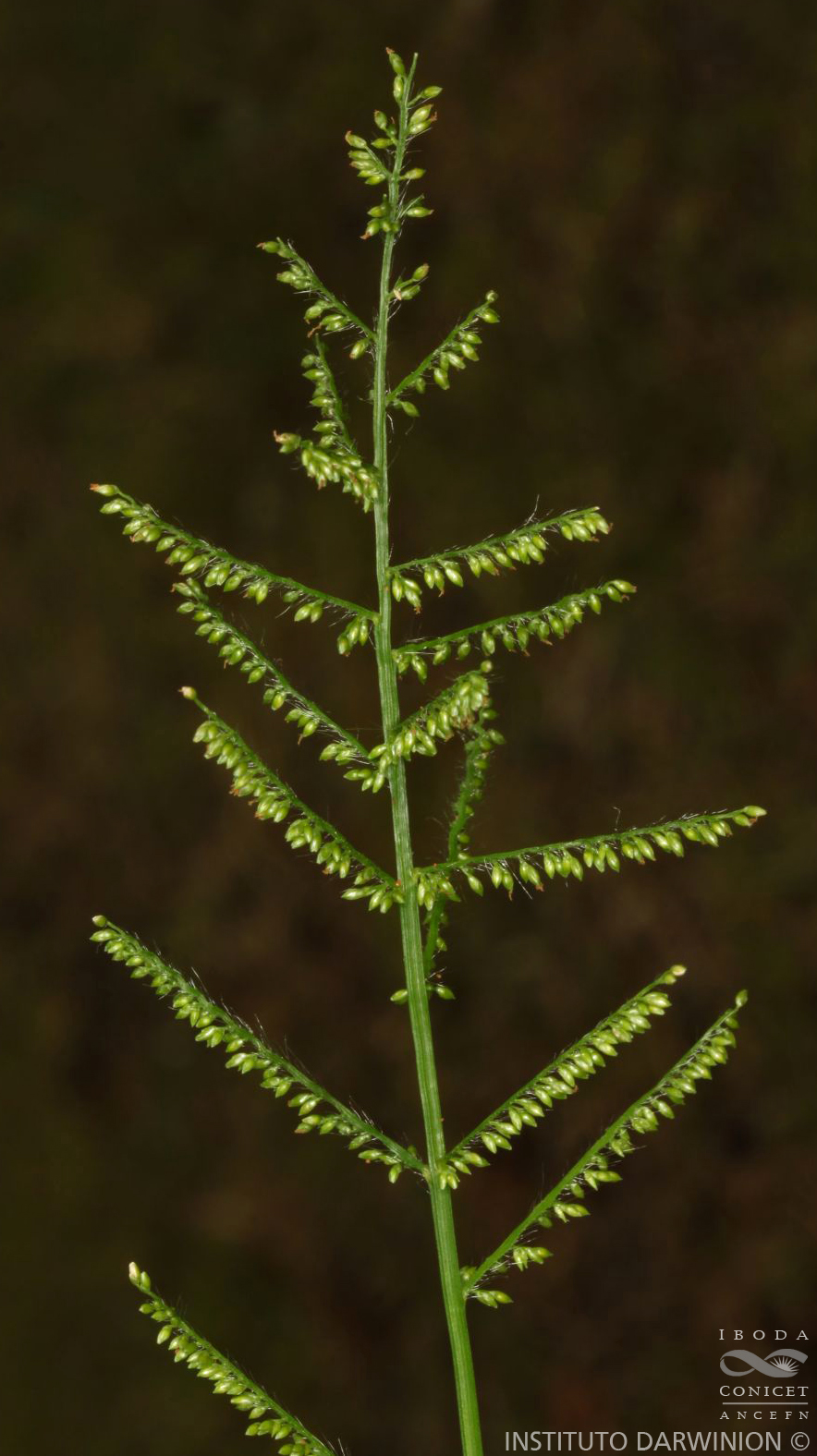 Plantas de duración indefinida, probablemente perennes, estoloníferas; cañas decumbentes, arraigadas y ramificadas en los nudos inferiores, luego erectas, de 10-70 cm de alto; entrenudos de 1,5-13 cm de largo, comprimidos, glabros, nudos castaños a violáceos, glabros a densamente cubiertos de pelos blanquecinos; vainas de 3-9 cm de largo, usualmente más cortas que los entrenudos, densamente papiloso-pilosas a glabras, los márgenes pilosos, más densamente hacia la porción distal, cuello castaño, piloso a glabro; lígulas reducidas, membranáceas a comúnmente ausentes; láminas lanceoladas, de 6-28 cm x 5-20 mm, cortamente pseudopecioladas, de base subcordada y asimétrica, glabras a esparcidamente cubiertas de pelos tuberculados en ambas superficies, los márgenes escabrosos. Inflorescencia terminal, laxa, de 9-20 x 2-8 cm; eje principal y ramificaciones escabrosas, con largos pelos, pulvínulos pilosos, las espiguillas apretadas y pareadas, dispuestas unilateralmente sobre las ramificaciones de primer orden, éstas divergentes, ascendentes, ramificaciones de segundo orden ausentes, ocasionalmente presentes hacia la base de la inflorescencia; pedicelos escabriúsculos, de 0,4-1 mm de largo. Espiguillas angostamente elipsoides, de 1,2-1,5 x 0,5-0,6 mm, biconvexas, glabras a esparcidamente pilosas; gluma inferior de 0,7-1 mm de largo, 5-nervia, el nervio medio escabroso; gluma superior de 1,3-1,5 mm de largo, 5-nervia, el nervio medio escabroso; lemma inferior de 1,2-1,4 mm de largo, 3-nervia, glumiforme; pálea inferior de 0,4-1,1 x 0,2-0,5 mm, tan larga como la lemma inferior a reducida, membranácea; antecio superior angostamente elipsoide, de 1,2-1,4 x 0,4-0,6 mm, glabro, liso, finamente escabroso hacia el ápice, la lemma con papilas simples en su superficie; cariopsis anchamente elipsoidea, castaña, de 0,8 x 0,5 mm; hilo punctiforme, embrión menos de ½ del largo de la cariopsis