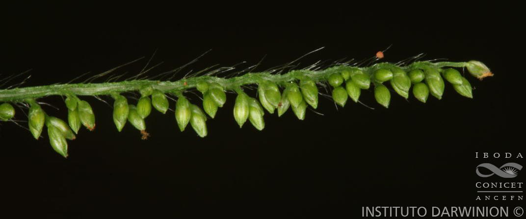 Plantas de duración indefinida, probablemente perennes, estoloníferas; cañas decumbentes, arraigadas y ramificadas en los nudos inferiores, luego erectas, de 10-70 cm de alto; entrenudos de 1,5-13 cm de largo, comprimidos, glabros, nudos castaños a violáceos, glabros a densamente cubiertos de pelos blanquecinos; vainas de 3-9 cm de largo, usualmente más cortas que los entrenudos, densamente papiloso-pilosas a glabras, los márgenes pilosos, más densamente hacia la porción distal, cuello castaño, piloso a glabro; lígulas reducidas, membranáceas a comúnmente ausentes; láminas lanceoladas, de 6-28 cm x 5-20 mm, cortamente pseudopecioladas, de base subcordada y asimétrica, glabras a esparcidamente cubiertas de pelos tuberculados en ambas superficies, los márgenes escabrosos. Inflorescencia terminal, laxa, de 9-20 x 2-8 cm; eje principal y ramificaciones escabrosas, con largos pelos, pulvínulos pilosos, las espiguillas apretadas y pareadas, dispuestas unilateralmente sobre las ramificaciones de primer orden, éstas divergentes, ascendentes, ramificaciones de segundo orden ausentes, ocasionalmente presentes hacia la base de la inflorescencia; pedicelos escabriúsculos, de 0,4-1 mm de largo. Espiguillas angostamente elipsoides, de 1,2-1,5 x 0,5-0,6 mm, biconvexas, glabras a esparcidamente pilosas; gluma inferior de 0,7-1 mm de largo, 5-nervia, el nervio medio escabroso; gluma superior de 1,3-1,5 mm de largo, 5-nervia, el nervio medio escabroso; lemma inferior de 1,2-1,4 mm de largo, 3-nervia, glumiforme; pálea inferior de 0,4-1,1 x 0,2-0,5 mm, tan larga como la lemma inferior a reducida, membranácea; antecio superior angostamente elipsoide, de 1,2-1,4 x 0,4-0,6 mm, glabro, liso, finamente escabroso hacia el ápice, la lemma con papilas simples en su superficie; cariopsis anchamente elipsoidea, castaña, de 0,8 x 0,5 mm; hilo punctiforme, embrión menos de ½ del largo de la cariopsis