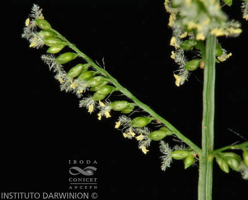 Plantas de duración indefinida, probablemente perennes, estoloníferas; cañas decumbentes, arraigadas y ramificadas en los nudos inferiores, luego erectas, de 10-70 cm de alto; entrenudos de 1,5-13 cm de largo, comprimidos, glabros, nudos castaños a violáceos, glabros a densamente cubiertos de pelos blanquecinos; vainas de 3-9 cm de largo, usualmente más cortas que los entrenudos, densamente papiloso-pilosas a glabras, los márgenes pilosos, más densamente hacia la porción distal, cuello castaño, piloso a glabro; lígulas reducidas, membranáceas a comúnmente ausentes; láminas lanceoladas, de 6-28 cm x 5-20 mm, cortamente pseudopecioladas, de base subcordada y asimétrica, glabras a esparcidamente cubiertas de pelos tuberculados en ambas superficies, los márgenes escabrosos. Inflorescencia terminal, laxa, de 9-20 x 2-8 cm; eje principal y ramificaciones escabrosas, con largos pelos, pulvínulos pilosos, las espiguillas apretadas y pareadas, dispuestas unilateralmente sobre las ramificaciones de primer orden, éstas divergentes, ascendentes, ramificaciones de segundo orden ausentes, ocasionalmente presentes hacia la base de la inflorescencia; pedicelos escabriúsculos, de 0,4-1 mm de largo. Espiguillas angostamente elipsoides, de 1,2-1,5 x 0,5-0,6 mm, biconvexas, glabras a esparcidamente pilosas; gluma inferior de 0,7-1 mm de largo, 5-nervia, el nervio medio escabroso; gluma superior de 1,3-1,5 mm de largo, 5-nervia, el nervio medio escabroso; lemma inferior de 1,2-1,4 mm de largo, 3-nervia, glumiforme; pálea inferior de 0,4-1,1 x 0,2-0,5 mm, tan larga como la lemma inferior a reducida, membranácea; antecio superior angostamente elipsoide, de 1,2-1,4 x 0,4-0,6 mm, glabro, liso, finamente escabroso hacia el ápice, la lemma con papilas simples en su superficie; cariopsis anchamente elipsoidea, castaña, de 0,8 x 0,5 mm; hilo punctiforme, embrión menos de ½ del largo de la cariopsis