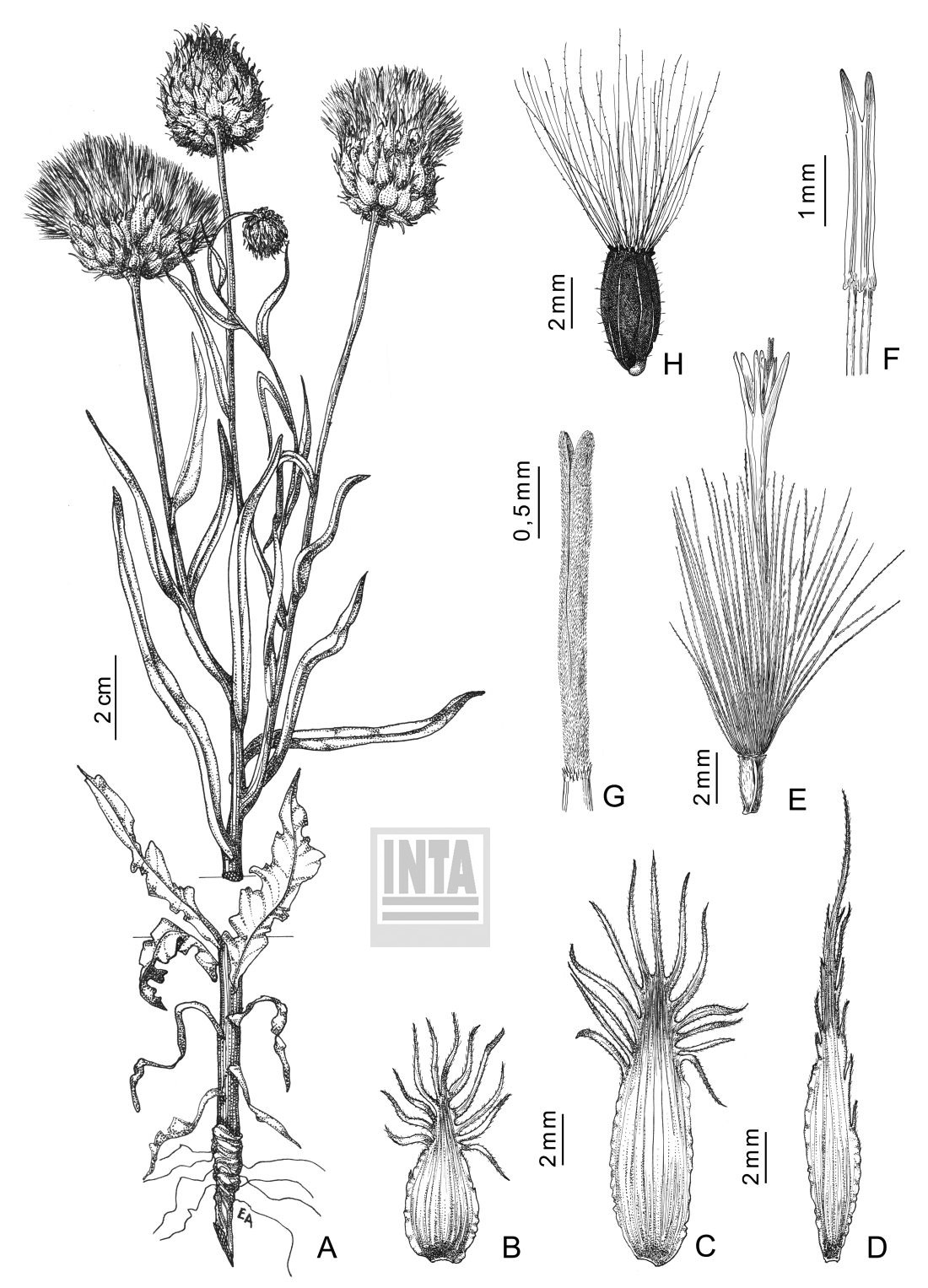 Hierbas anuales, hasta de 1,5 m de alto, con tallos erectos, a veces laxamente ramificados en la parte superior, costados, glabros o escabrosos y con glándulas. Hojas sésiles, láminas angostamente ovadas o lineares, de 3,5-12 × 0,5-1,5 cm, de base decurrente y ápice atenuado o agudo, las basales de margen entero o aserrado, en el resto siempre entero, haz y envés escabrosos y con glándulas. Capítulos homógamos, discoides, solitarios en las ramas terminales, con pedúnculos de (1,5-)3-15 cm de largo. Involucro anchamente ovoide o globoso, de 2-3 × 2- 3 cm; filarios 6-8 seriados, los externos cortamente ovados, ca. 0,5 × 0,1 cm, los medios ovados o elípticos, de 1-1,5 × 0,2-0,3 cm, ambos con un apéndice apical profundamente laciniado, de contorno obovado, los internos lineares o angostamente ovados, ca. 1,5 × 0,1 cm, de ápice atenuado y margen fimbriado. Receptáculo cubierto densamente de cerdas ca. 1,2 cm de largo Flores isomorfas 75-80, con corolas tubulosas, ca. 1,5 cm de largo, púrpuras o lilas, con lóbulos ca. 2,5 mm de largo, anteras violetas o azules y estilos rosados. Aquenios obovoides, ca. 4 × 1,5 mm, con un reborde apical anular y estrías longitudinales, laxamente pubescentes, negruzcos o castaño obscuros. Papus formado por numerosas cerdas, escabrosas, desiguales, hasta de 1,2 cm de largo, caducas o algo persistentes.