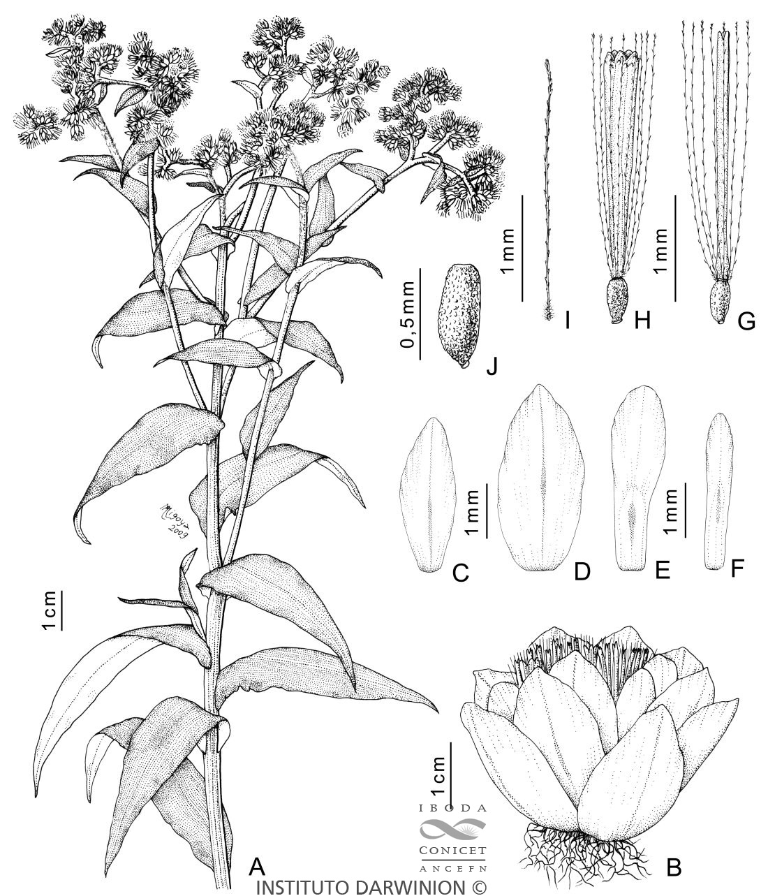 A. Planta. B. Capítulo. C-F. Filarios. G. Flor del margen. H. Flor del centro. I. Pelo del papus, mostrando las cilias patentes en la base. J. Aquenio.