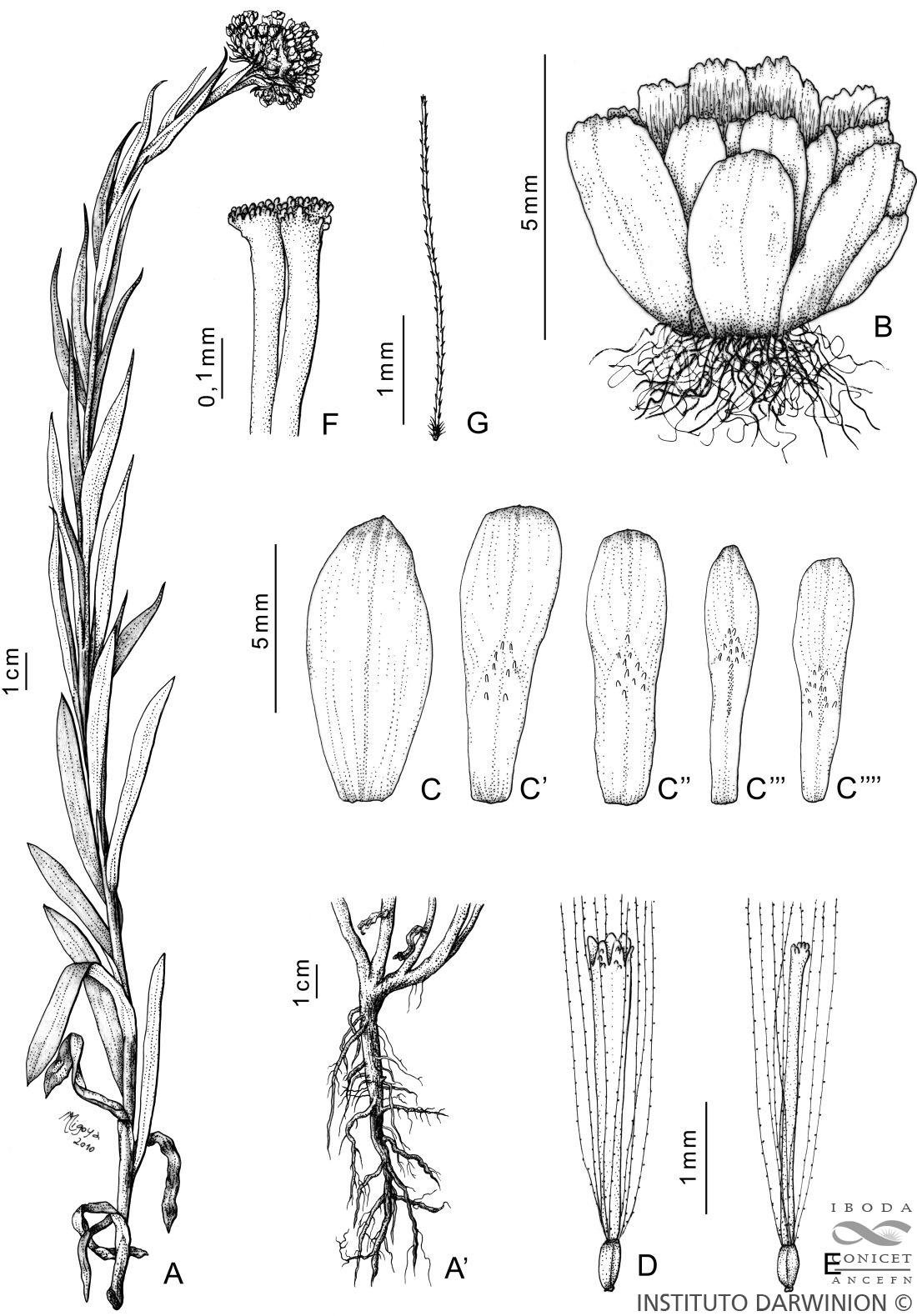 A, A’. Planta. B. Capítulo. C-C’’’’. Filarios. D. Flor del centro. E. Flor del margen. F. Parte superior del estilo. G. Pelo del papus, mostrando las cilias patentes en la base.